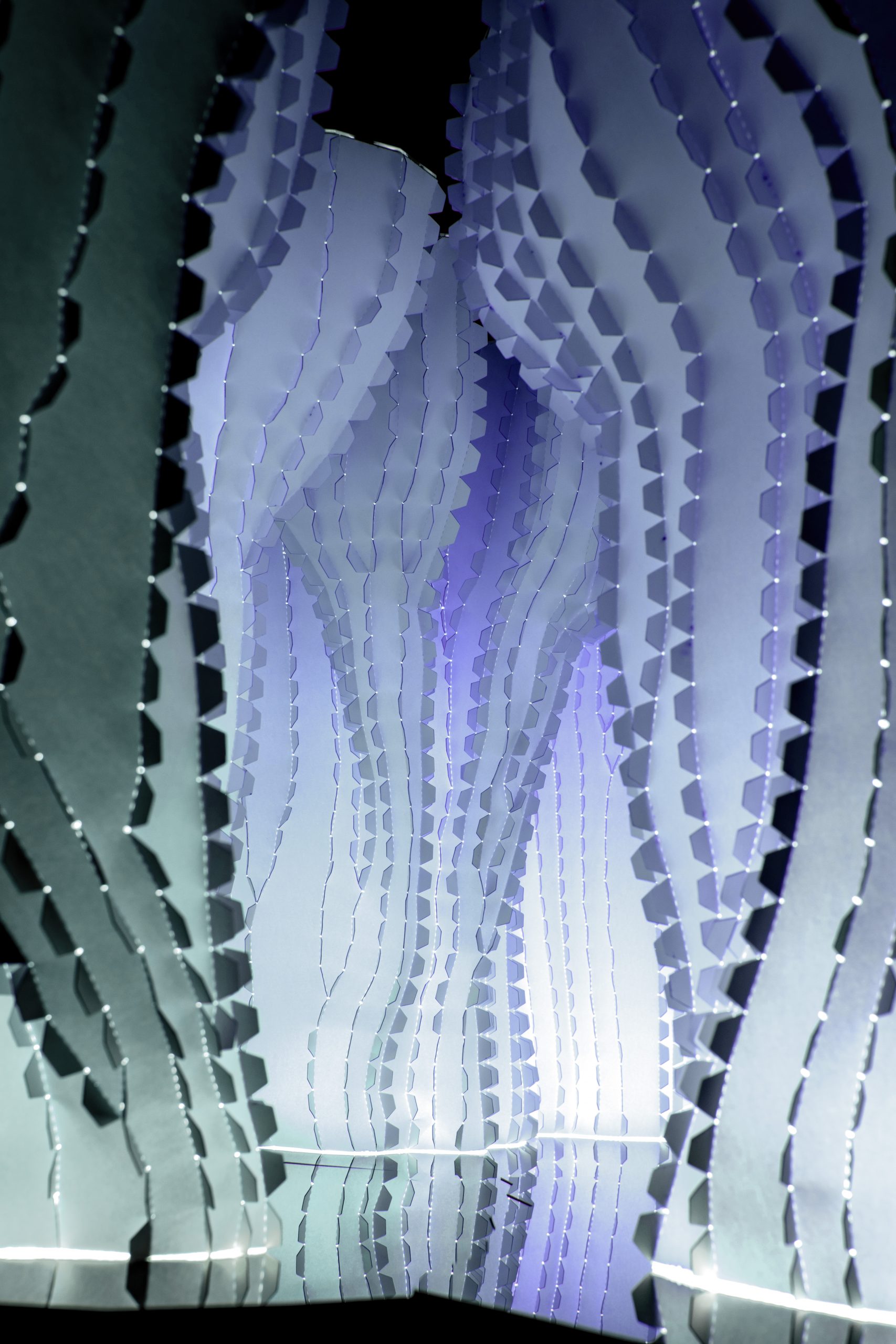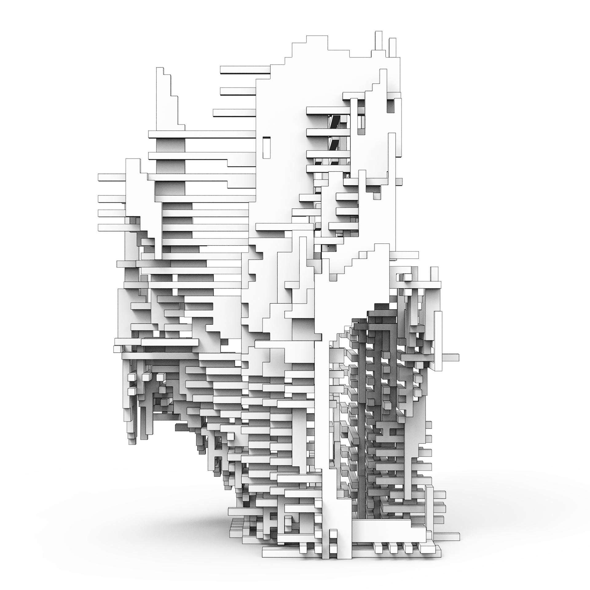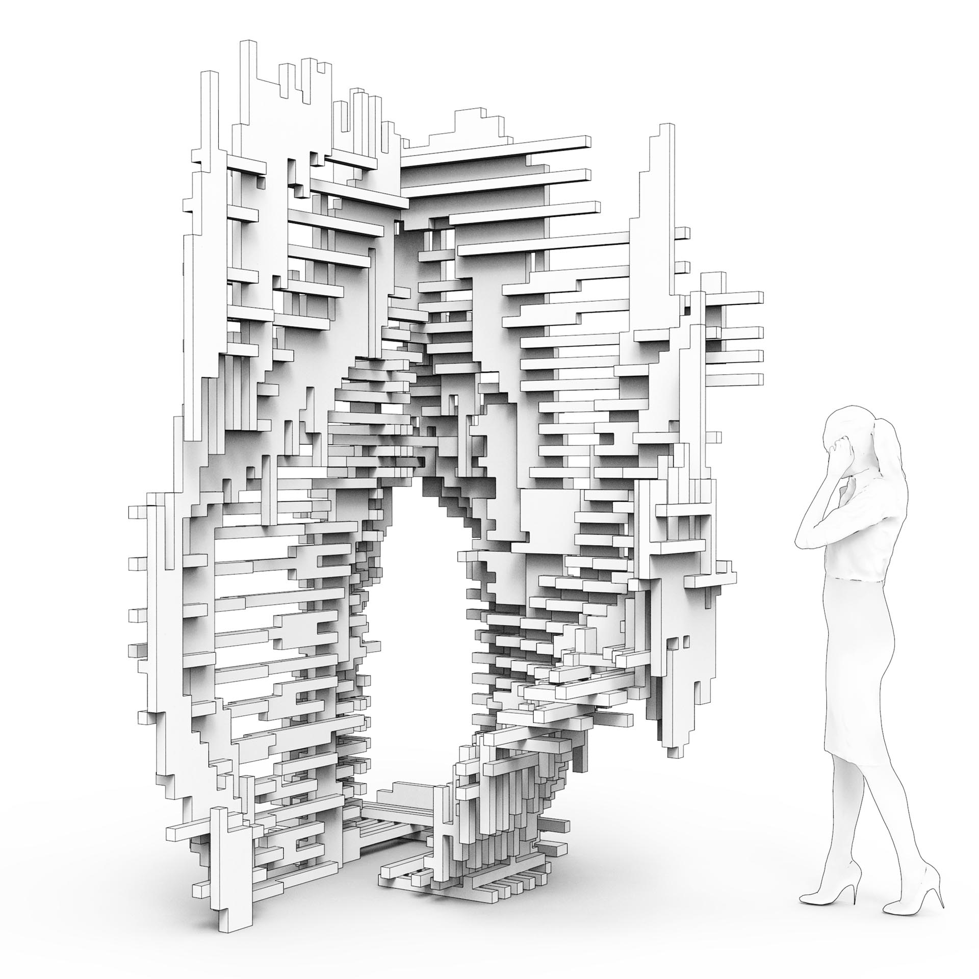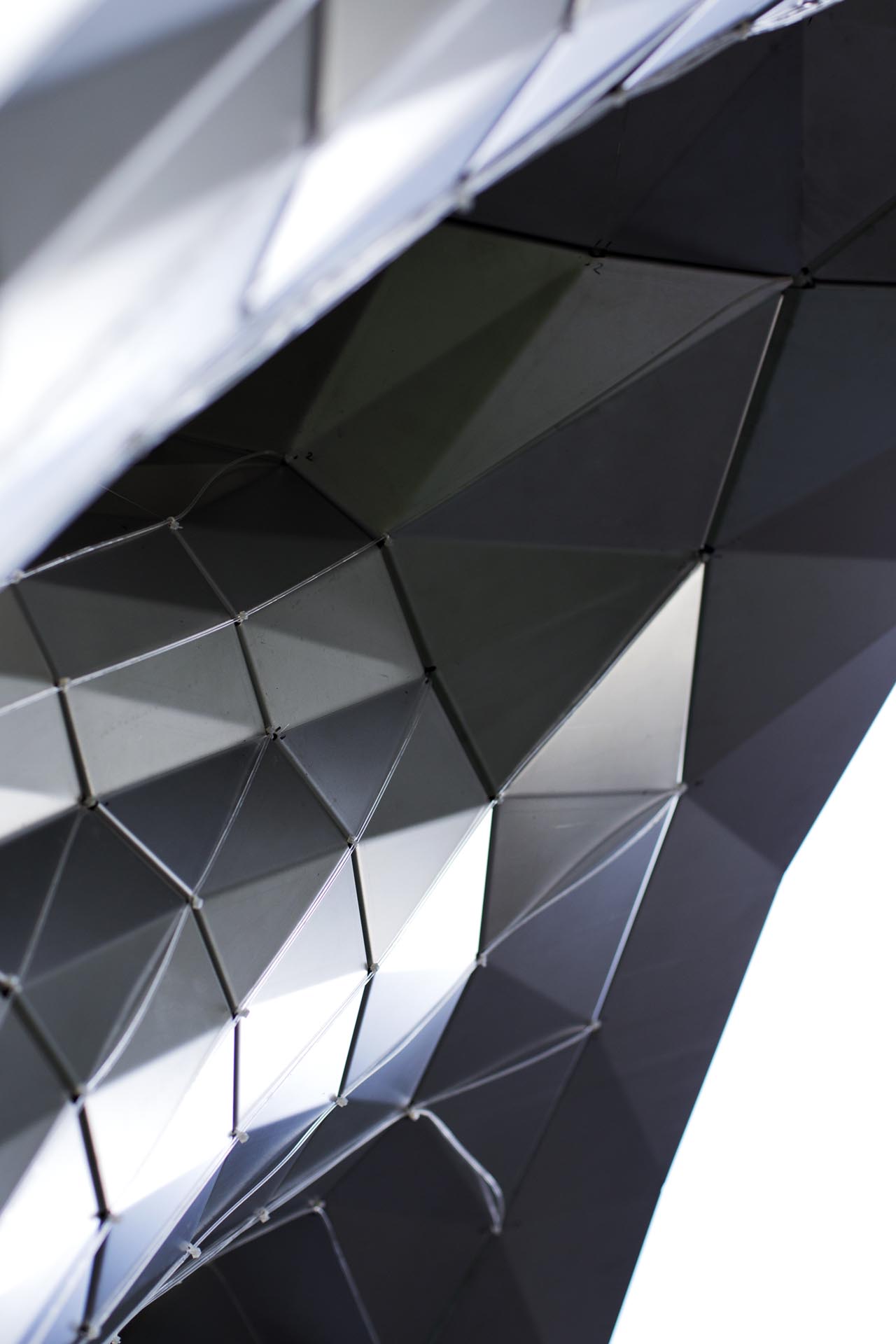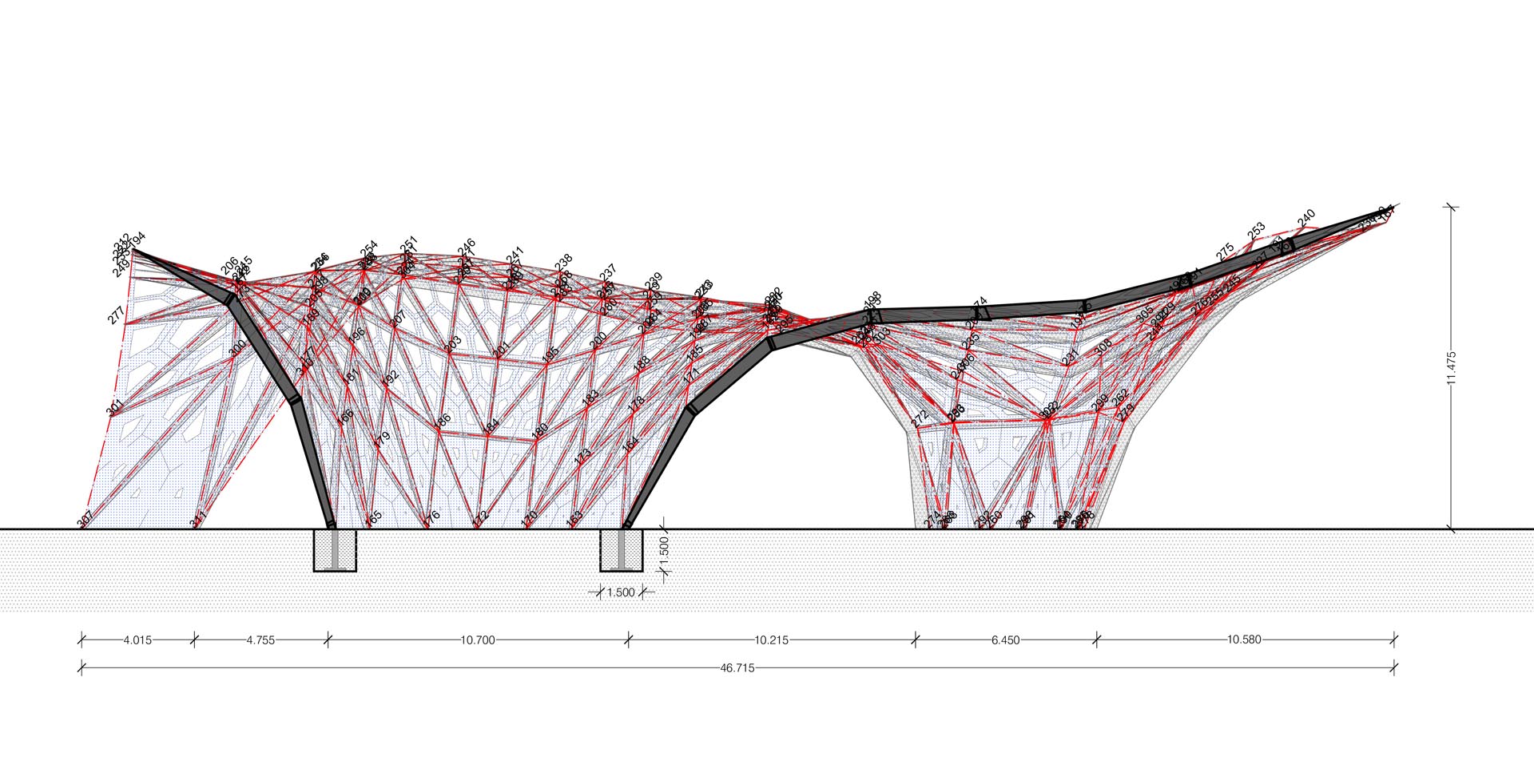 The positioning of the façade walls has been developed according to a custom written flow simulation. The algorithm describes a flow that is influenced and altered by a set of deflectors, which each act according to the magnitude of their attraction and the area of their influence.