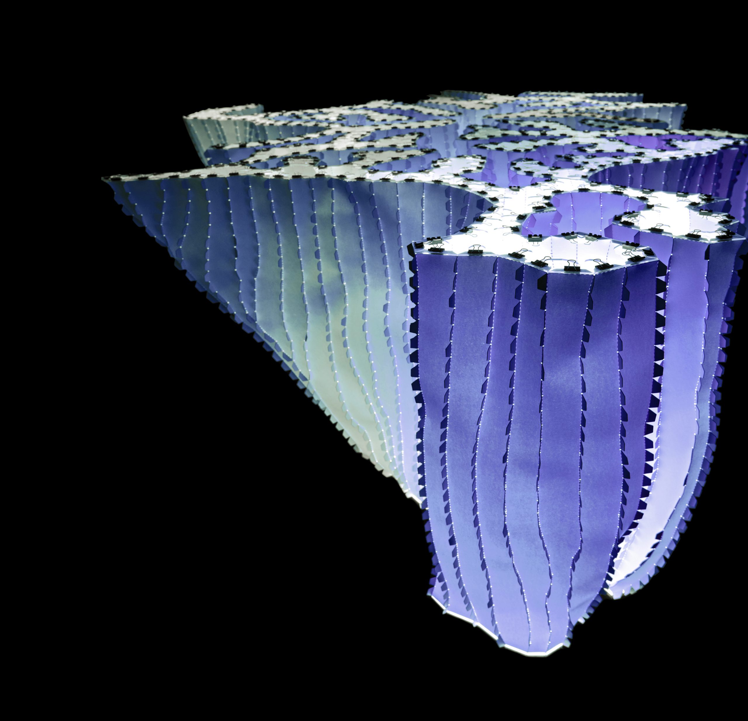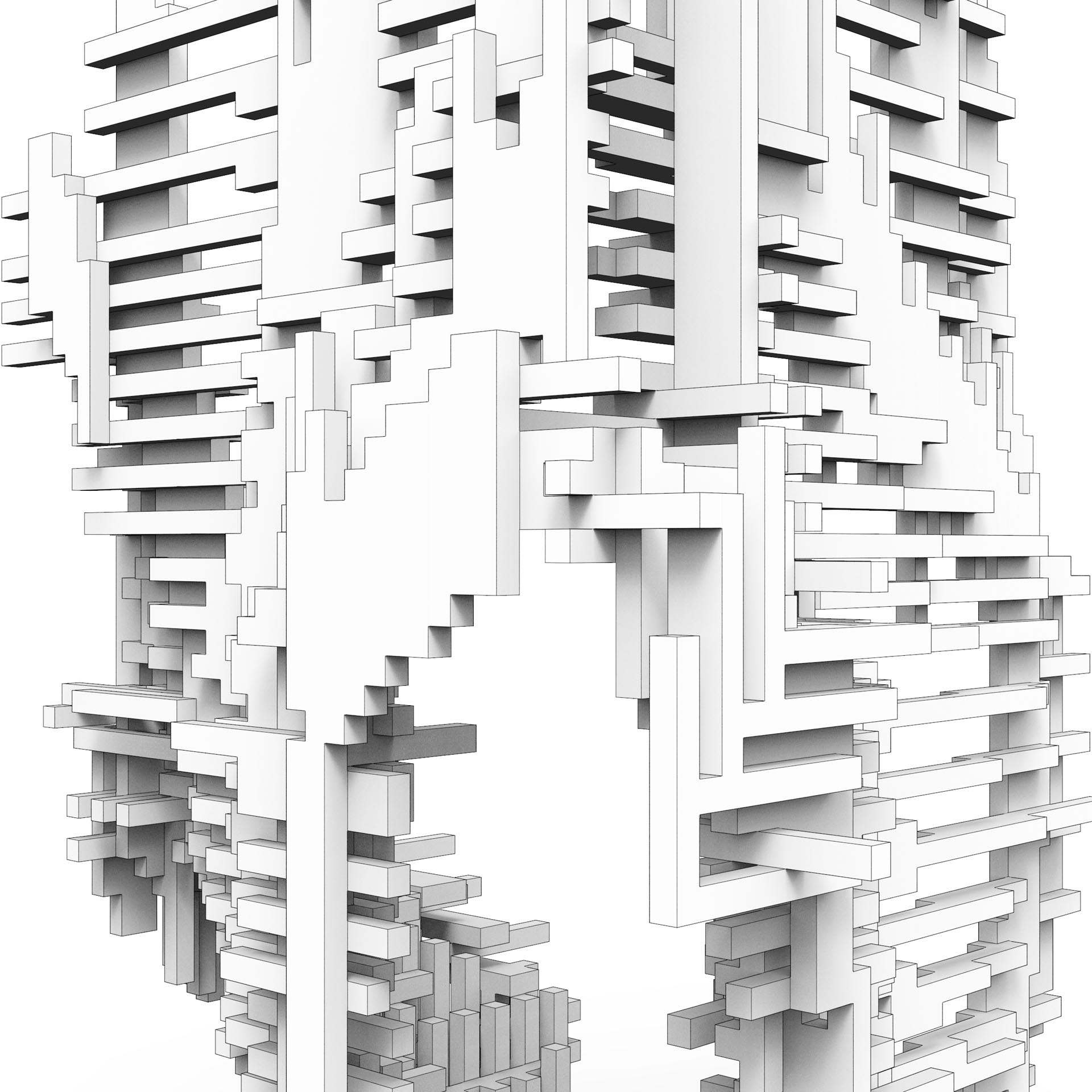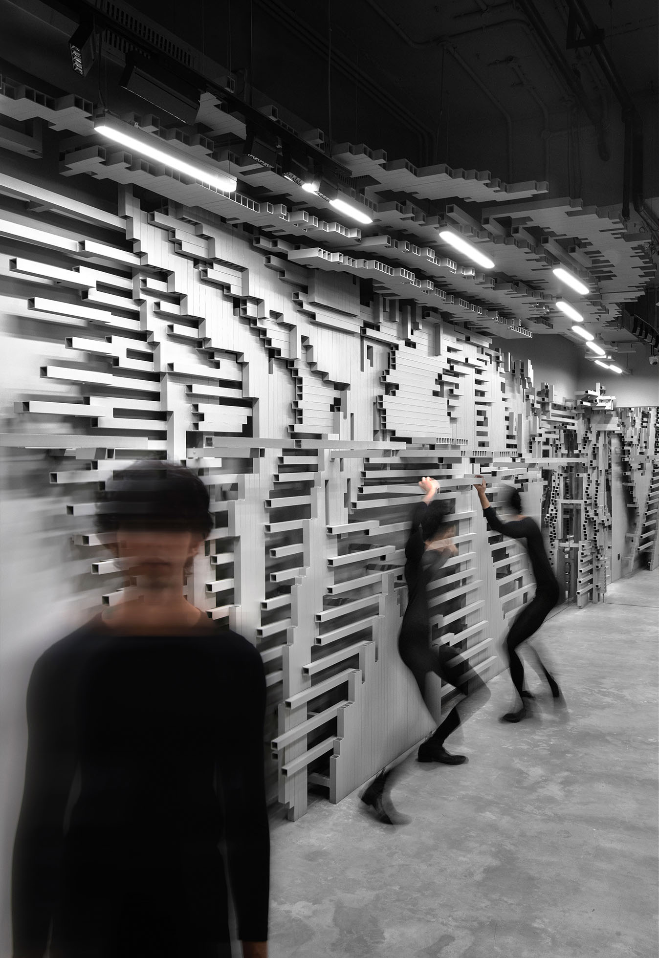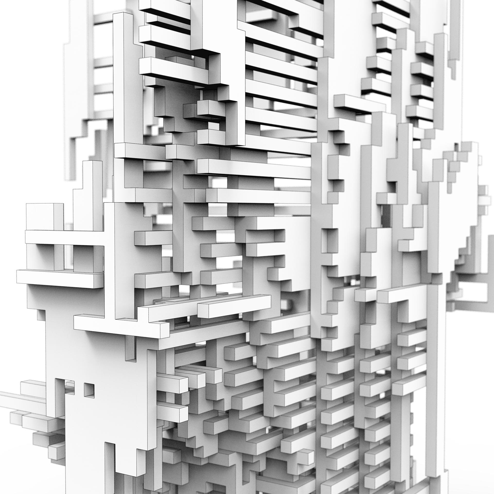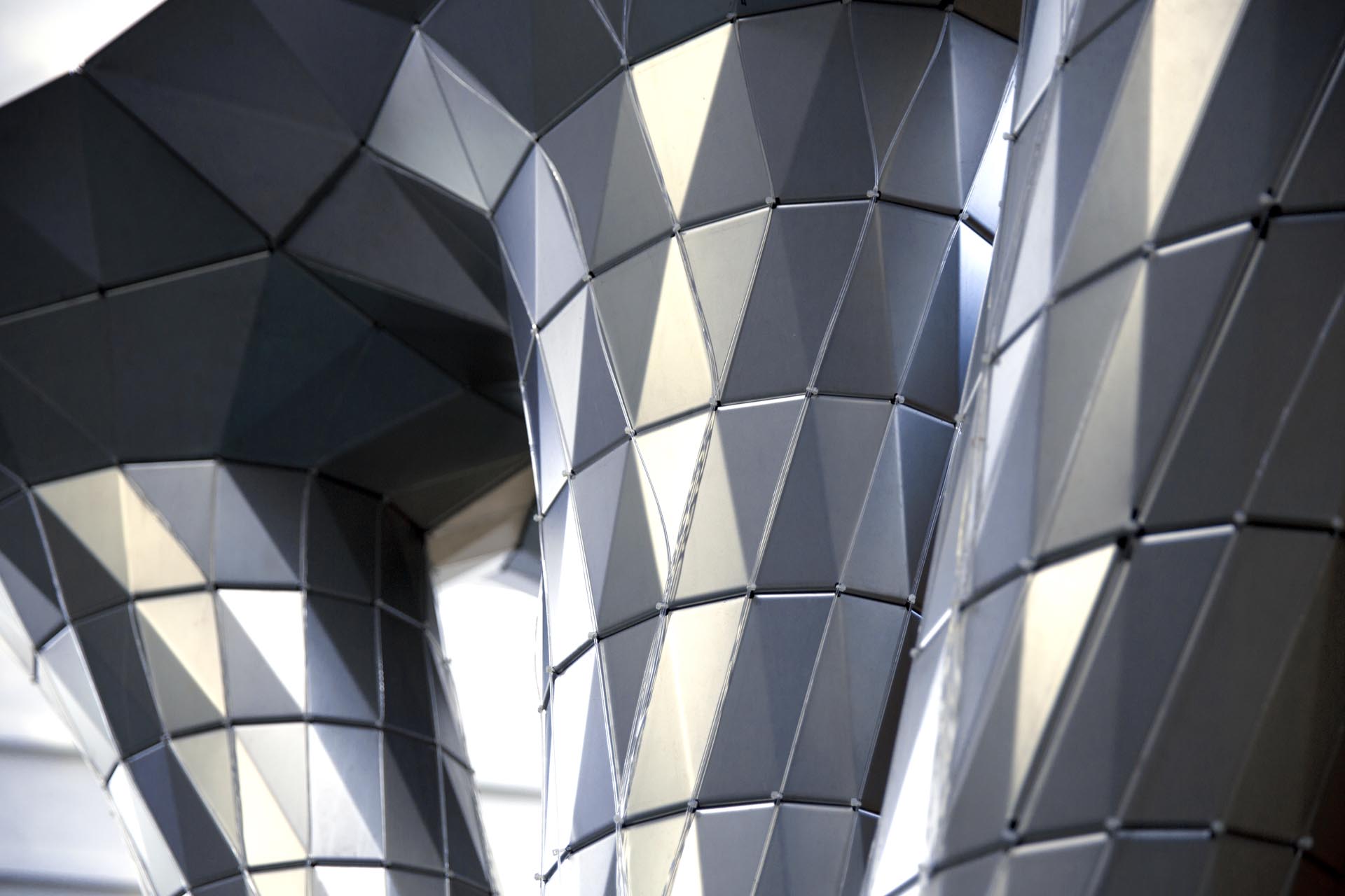 The positioning of the façade walls has been developed according to a custom written flow simulation. The algorithm describes a flow that is influenced and altered by a set of deflectors, which each act according to the magnitude of their attraction and the area of their influence.
