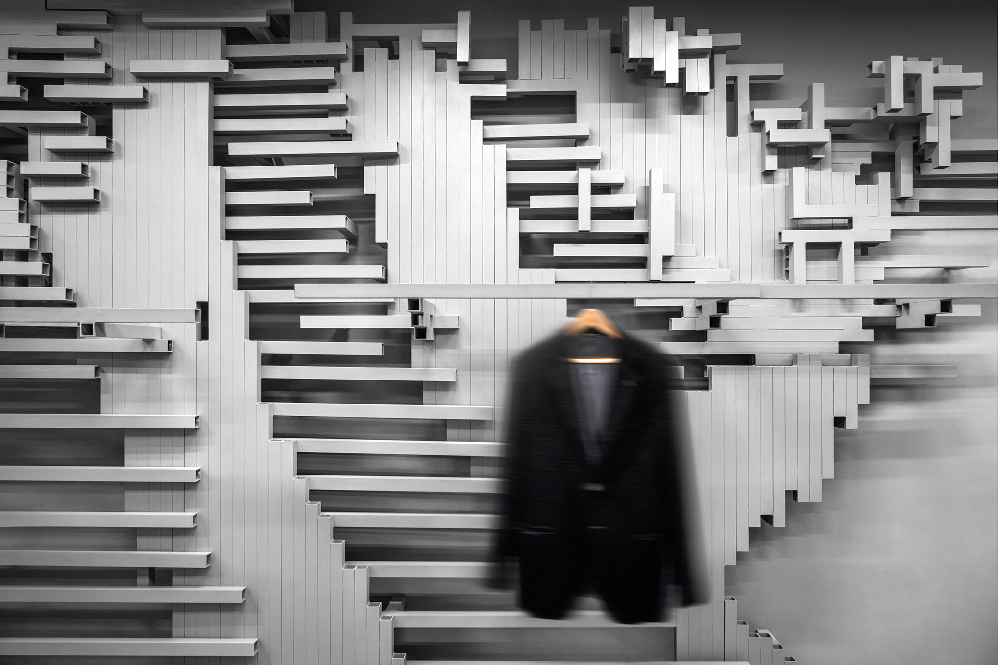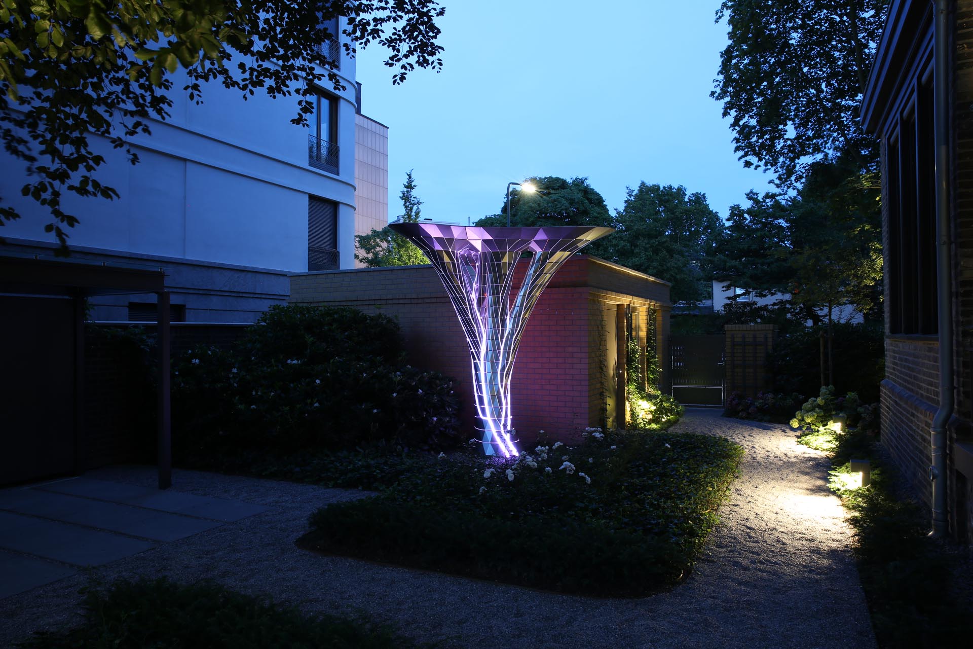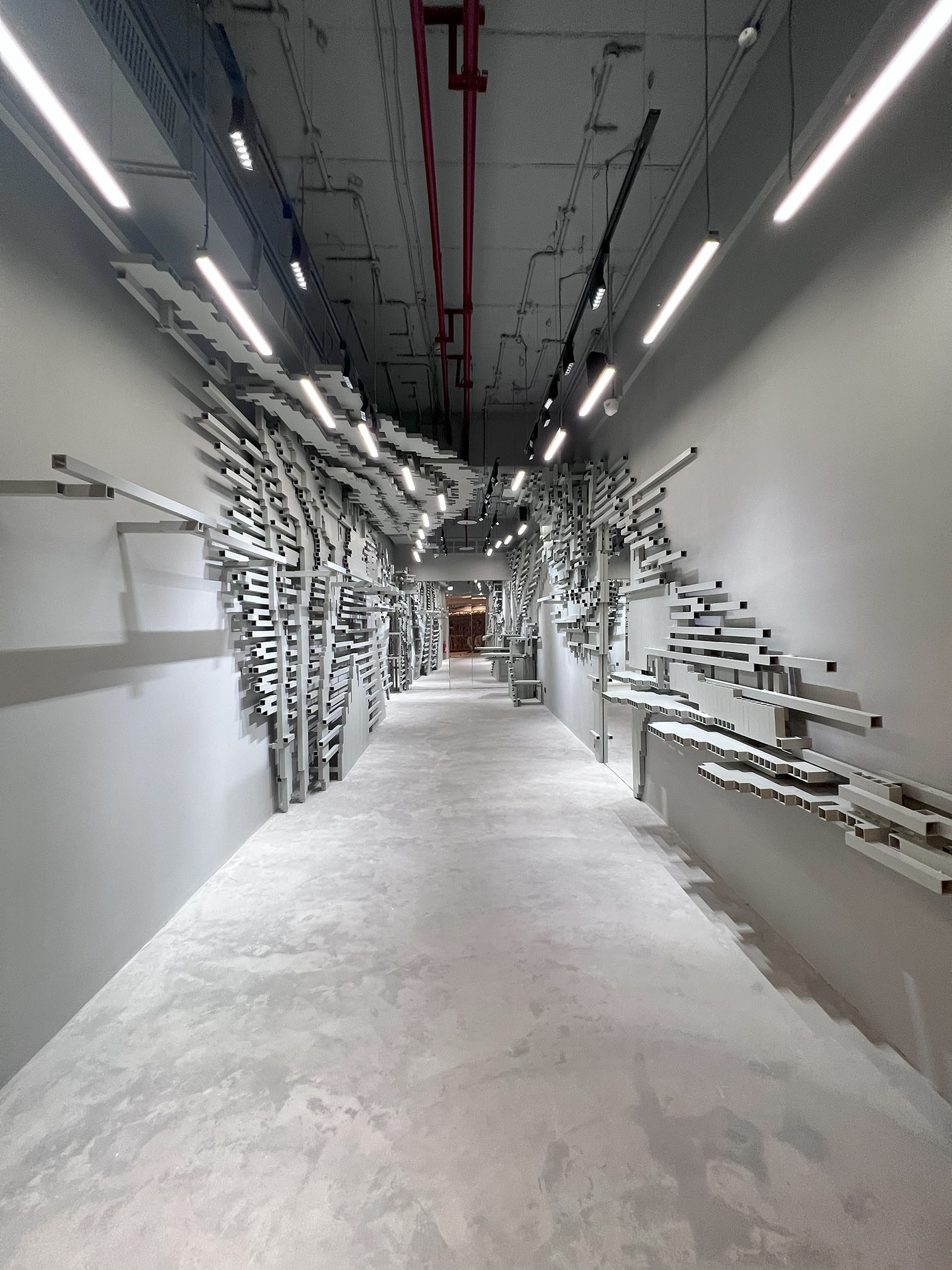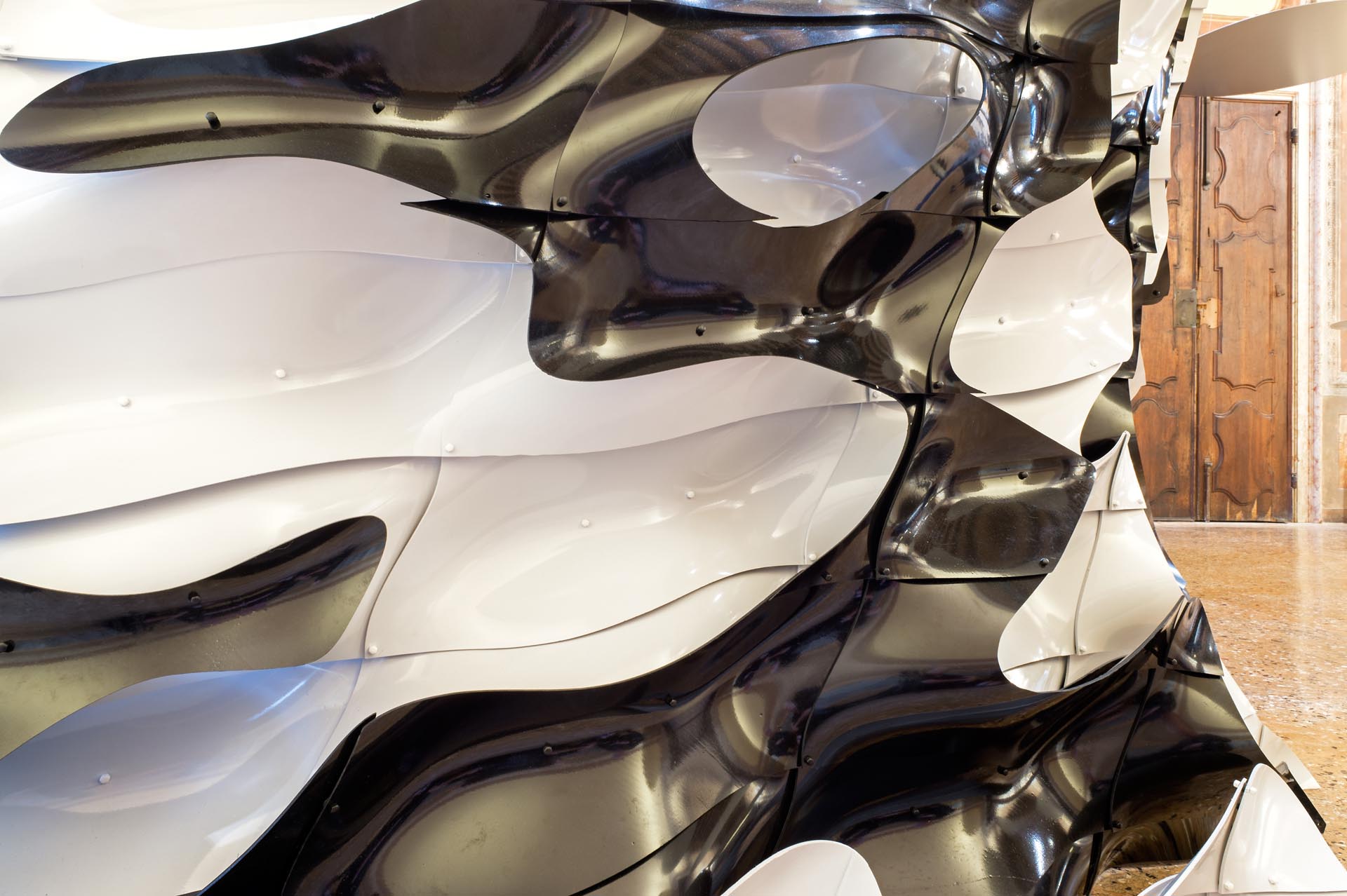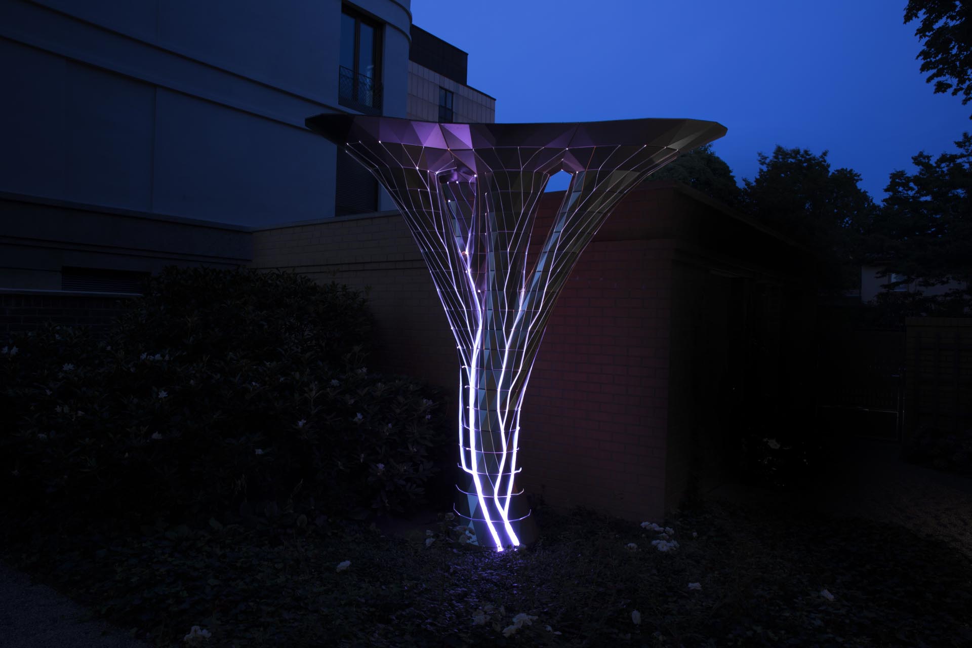 The positioning of the façade walls has been developed according to a custom written flow simulation. The algorithm describes a flow that is influenced and altered by a set of deflectors, which each act according to the magnitude of their attraction and the area of their influence.