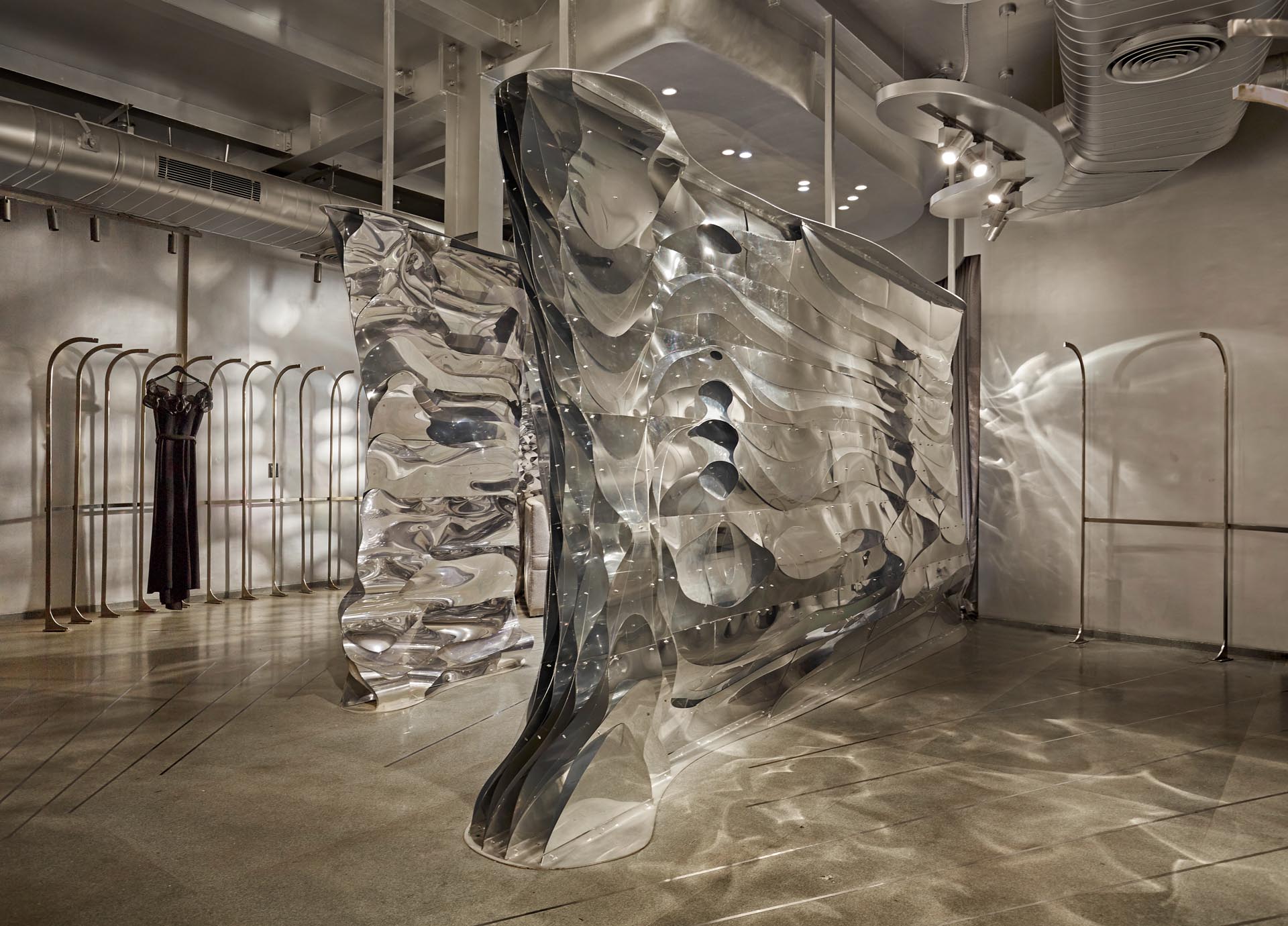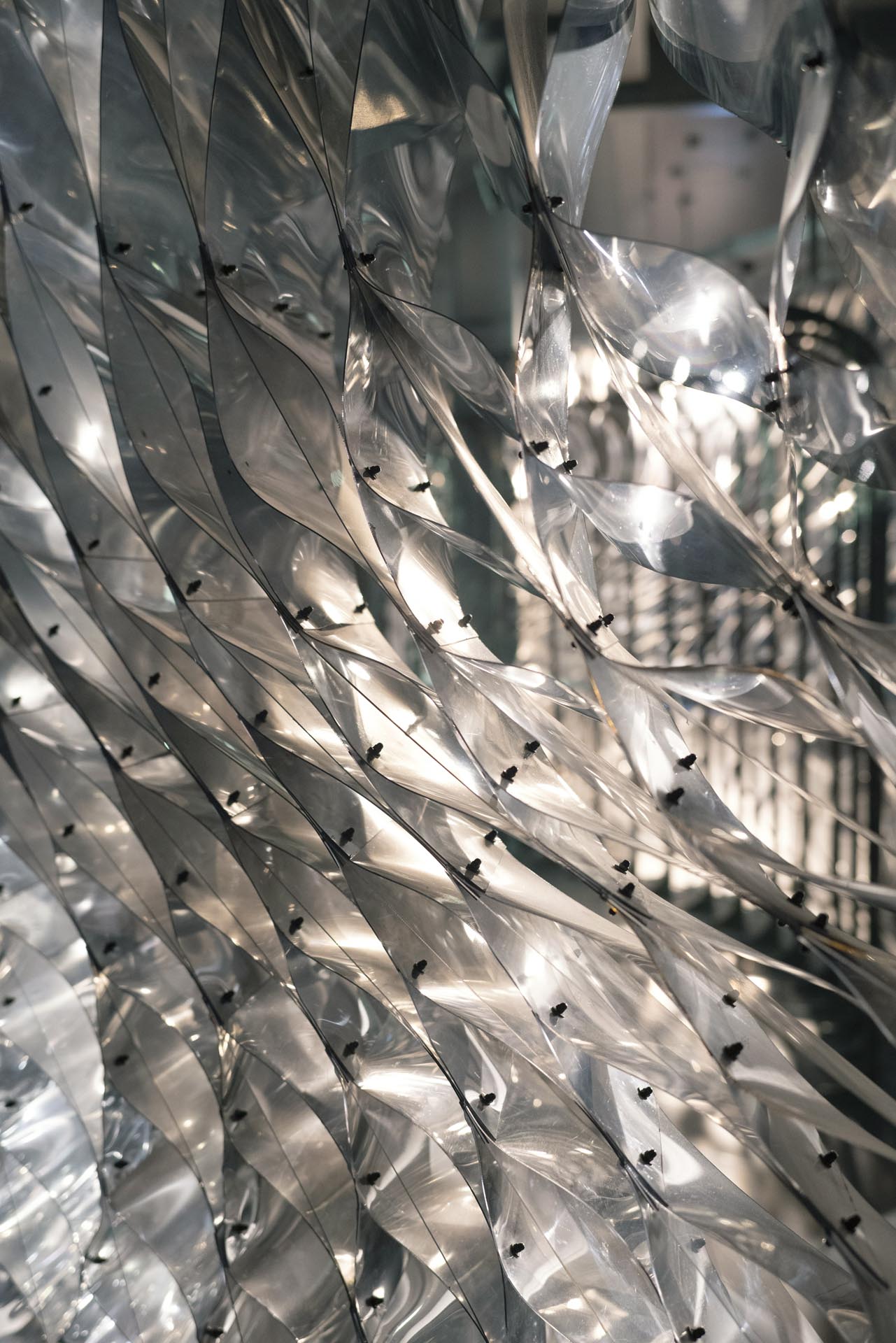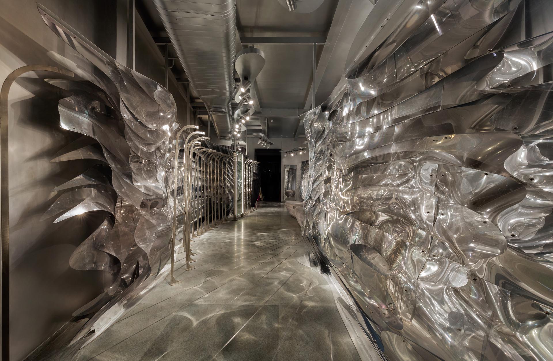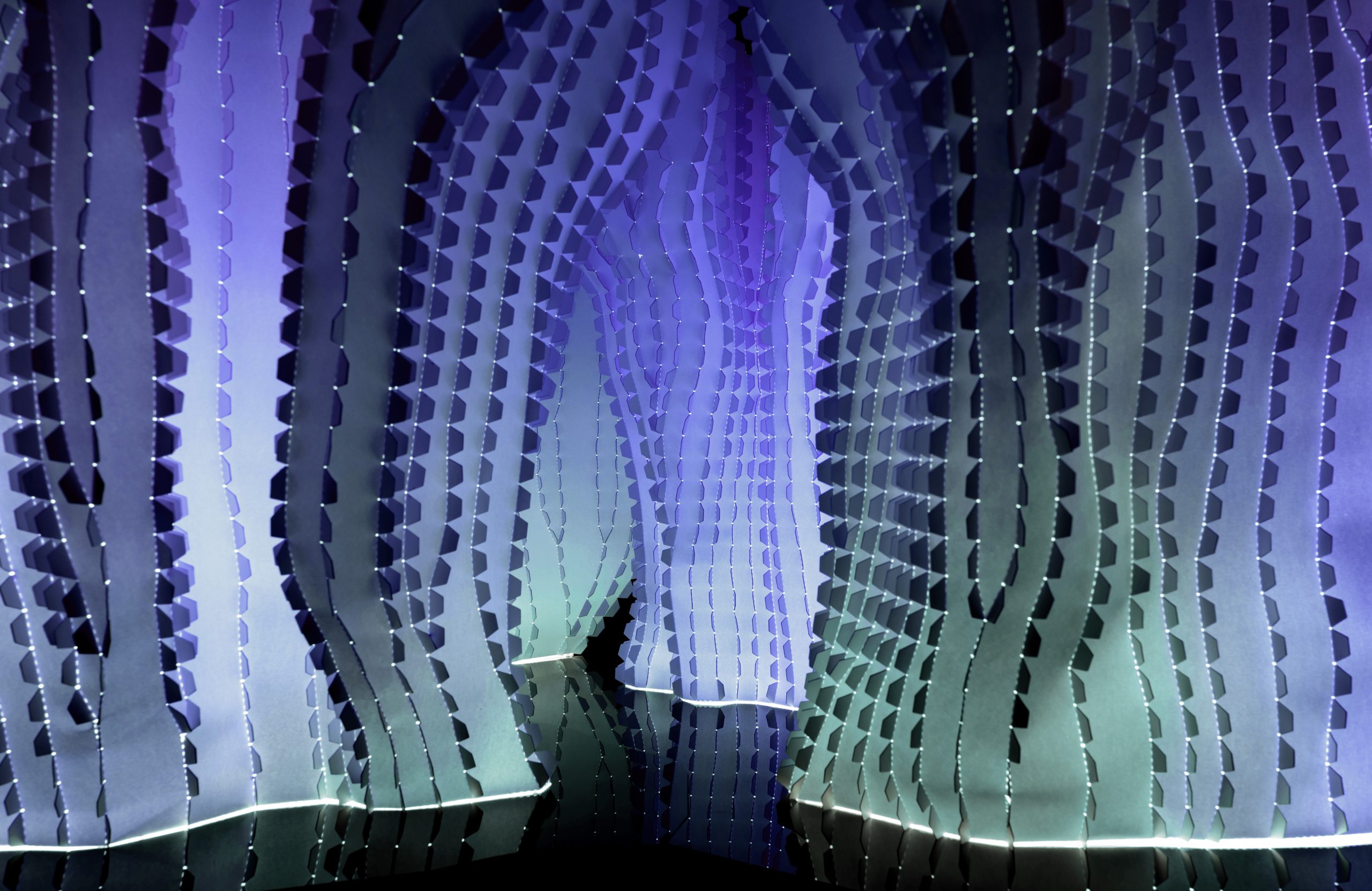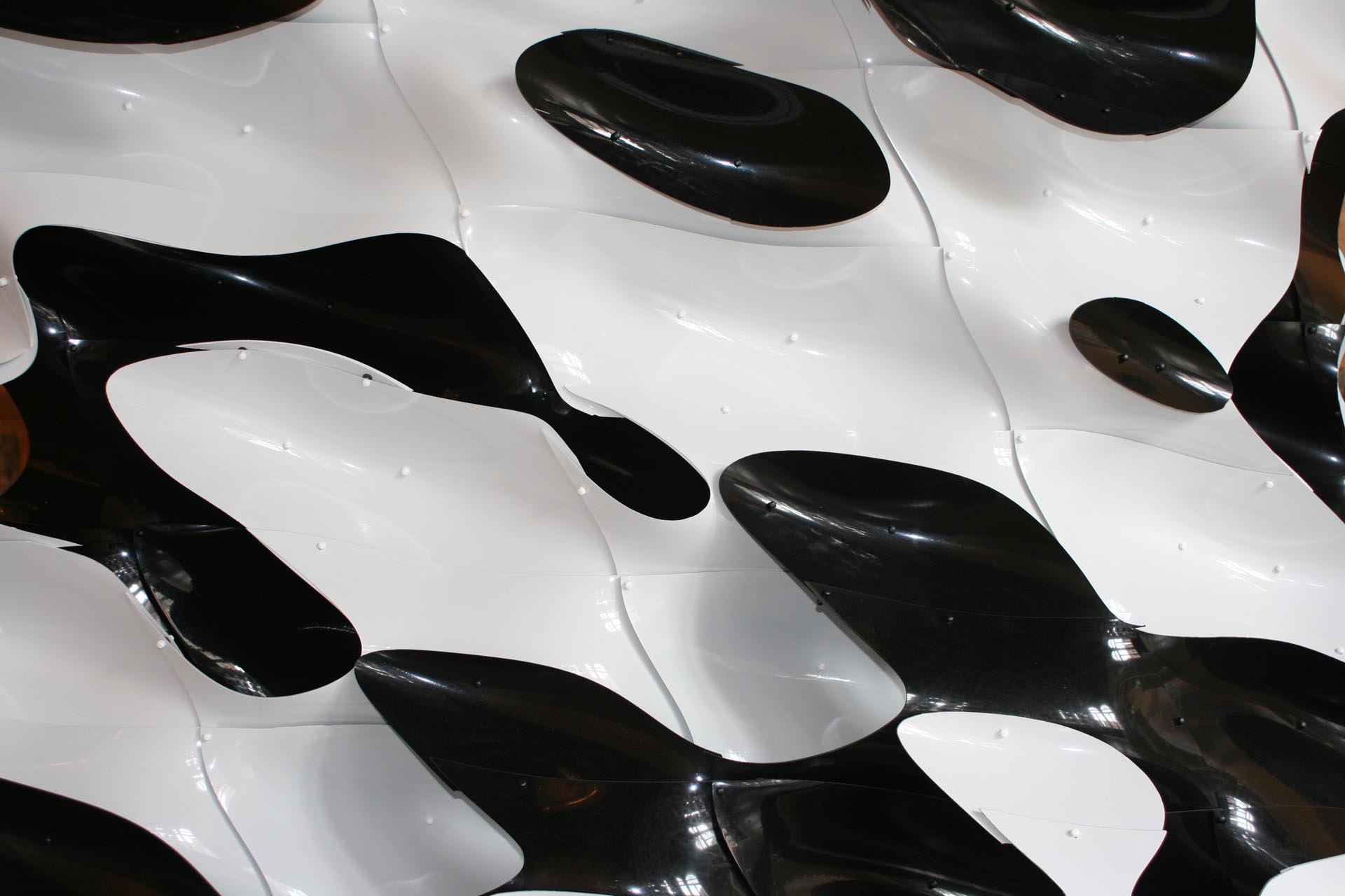 The positioning of the façade walls has been developed according to a custom written flow simulation. The algorithm describes a flow that is influenced and altered by a set of deflectors, which each act according to the magnitude of their attraction and the area of their influence.