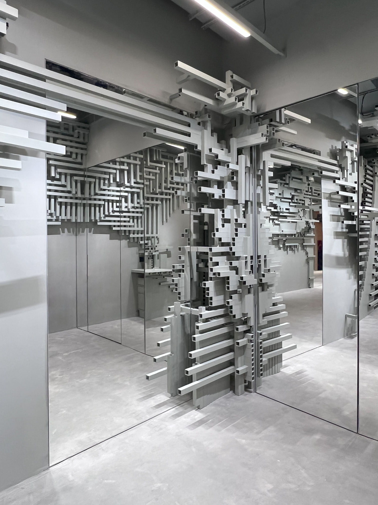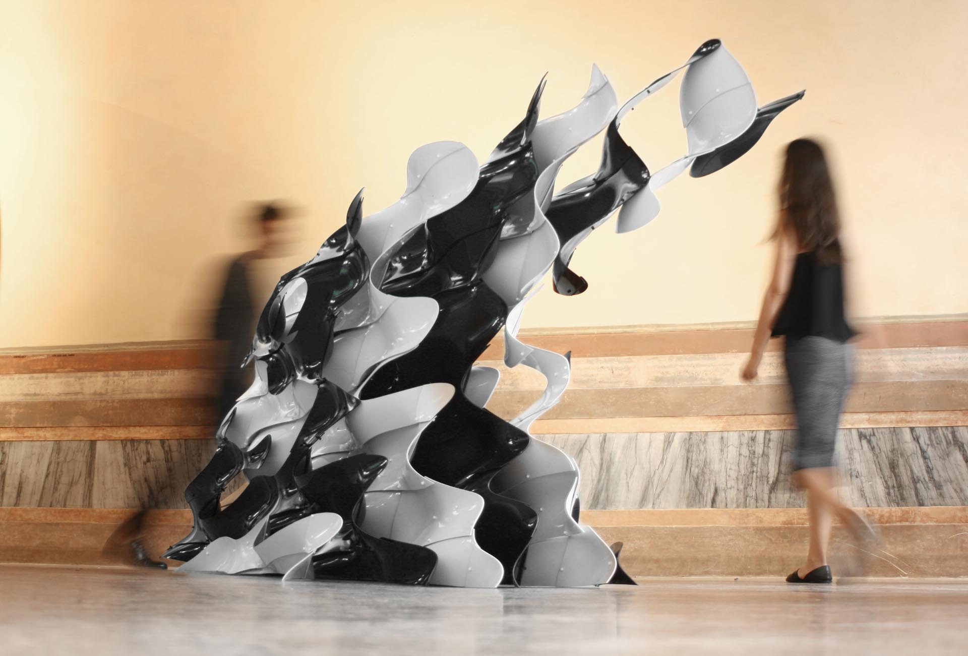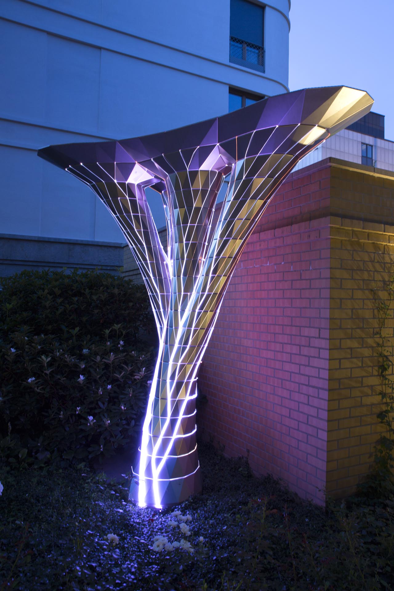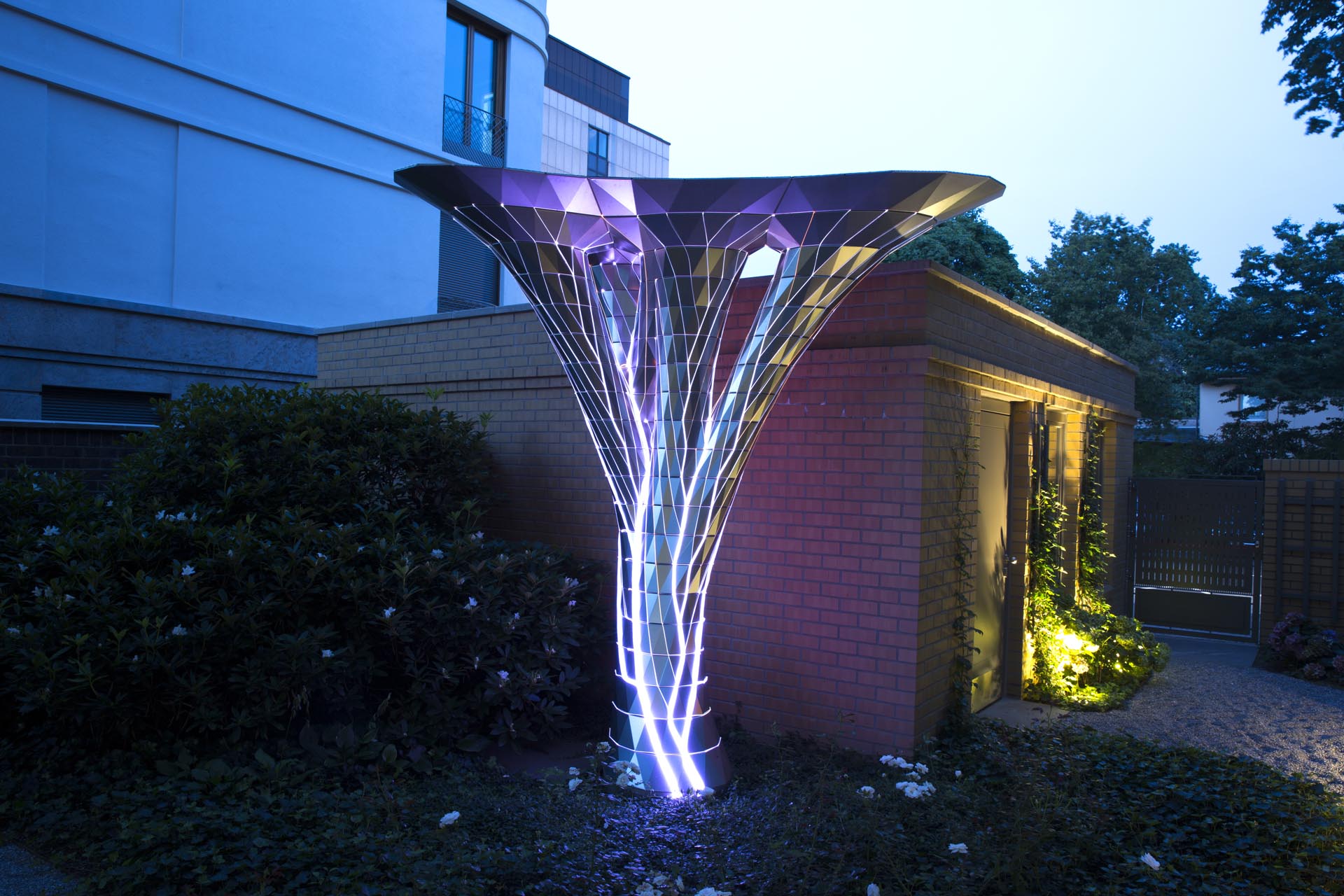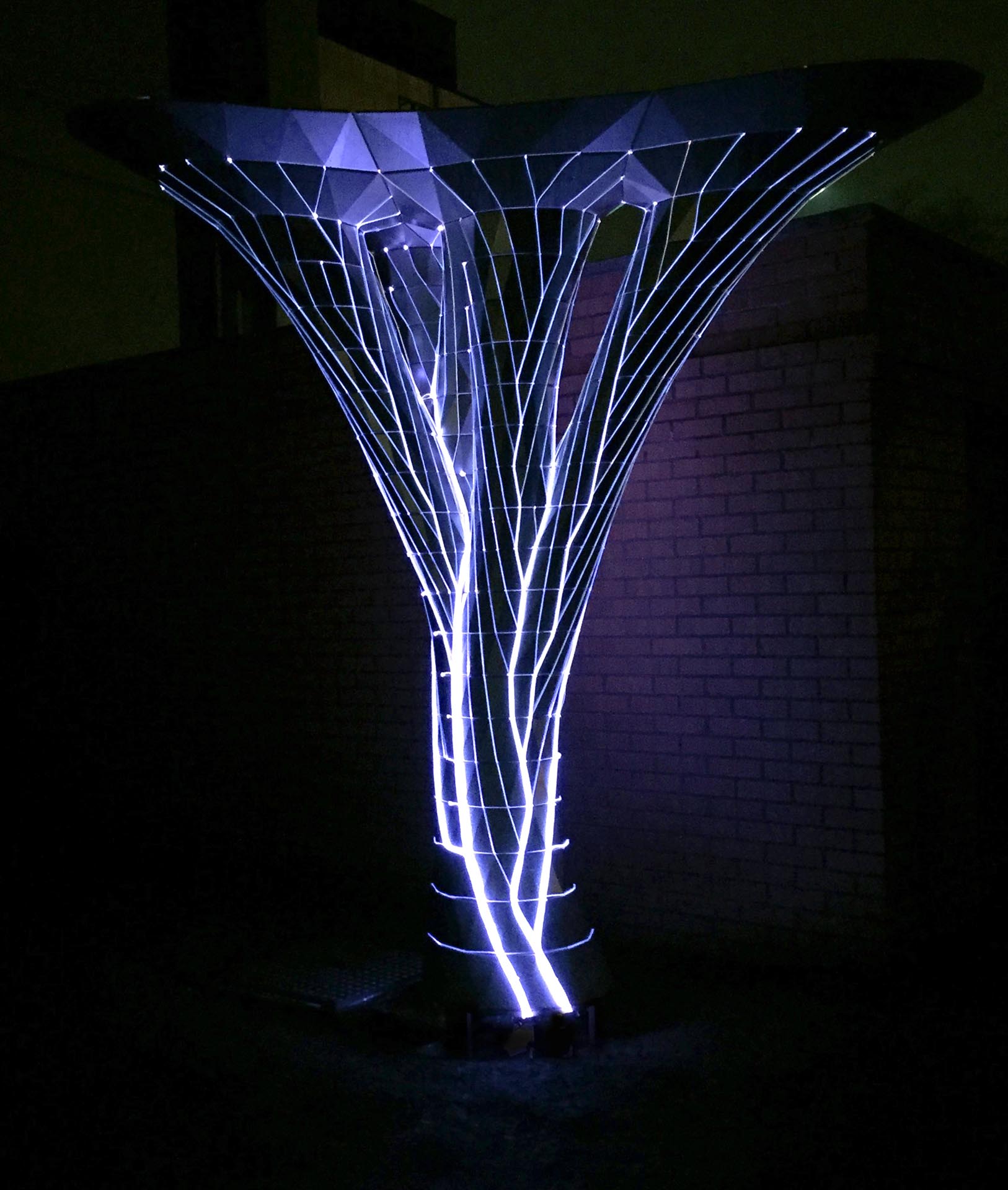 The positioning of the façade walls has been developed according to a custom written flow simulation. The algorithm describes a flow that is influenced and altered by a set of deflectors, which each act according to the magnitude of their attraction and the area of their influence.