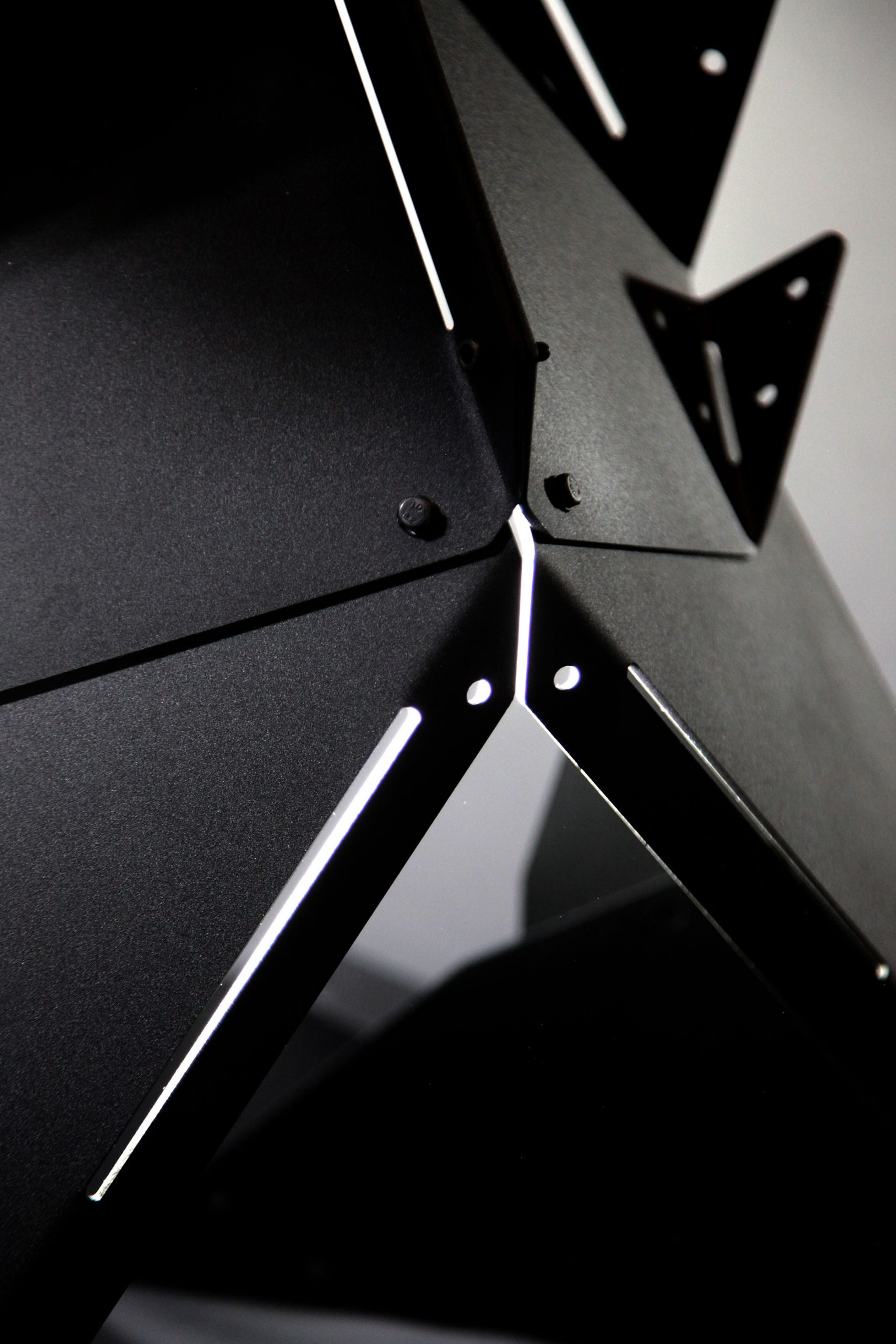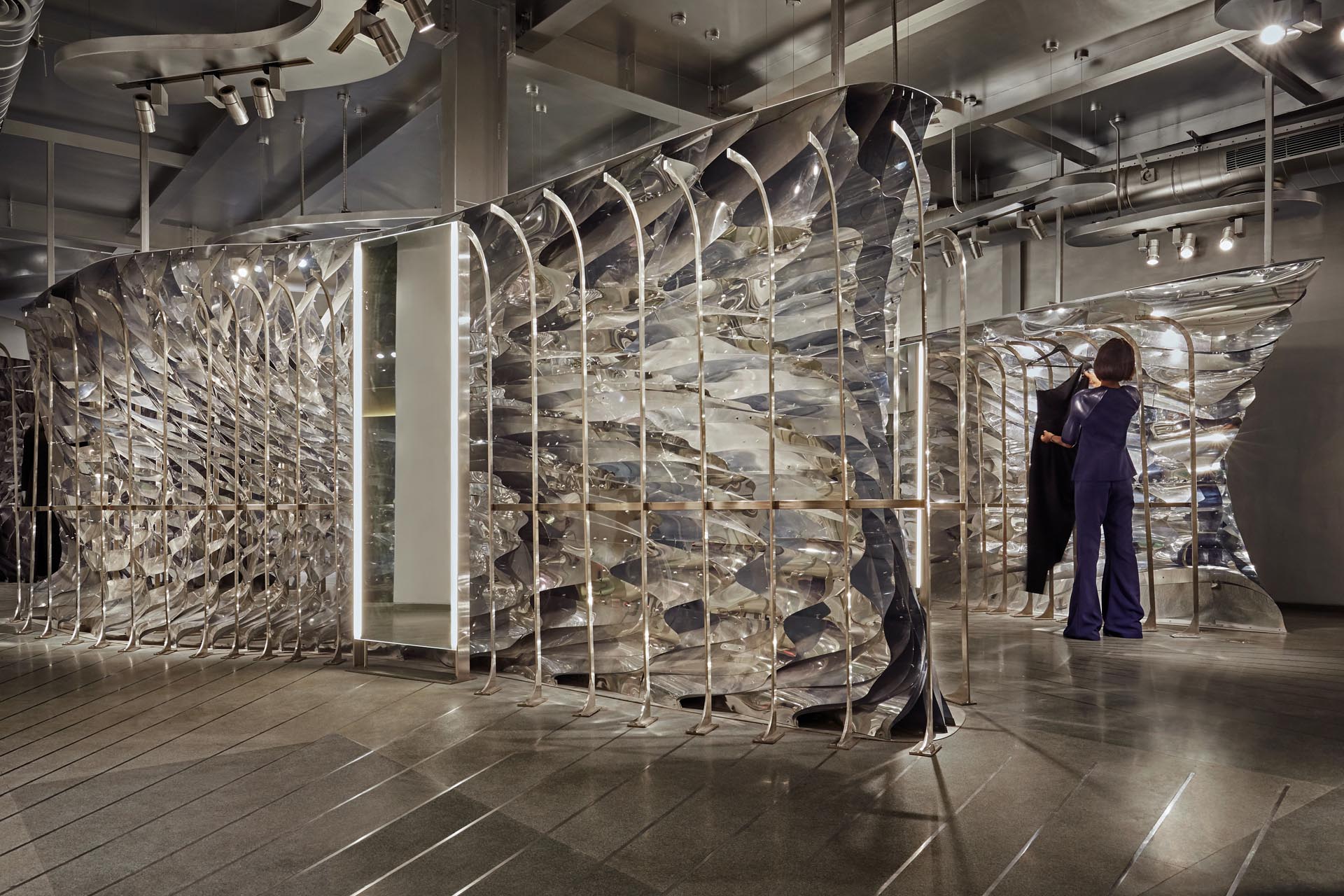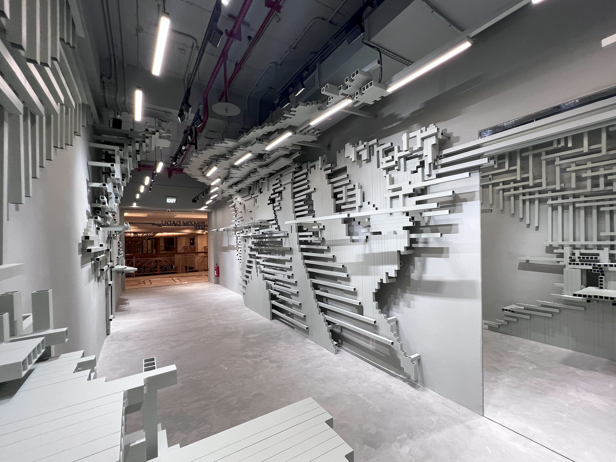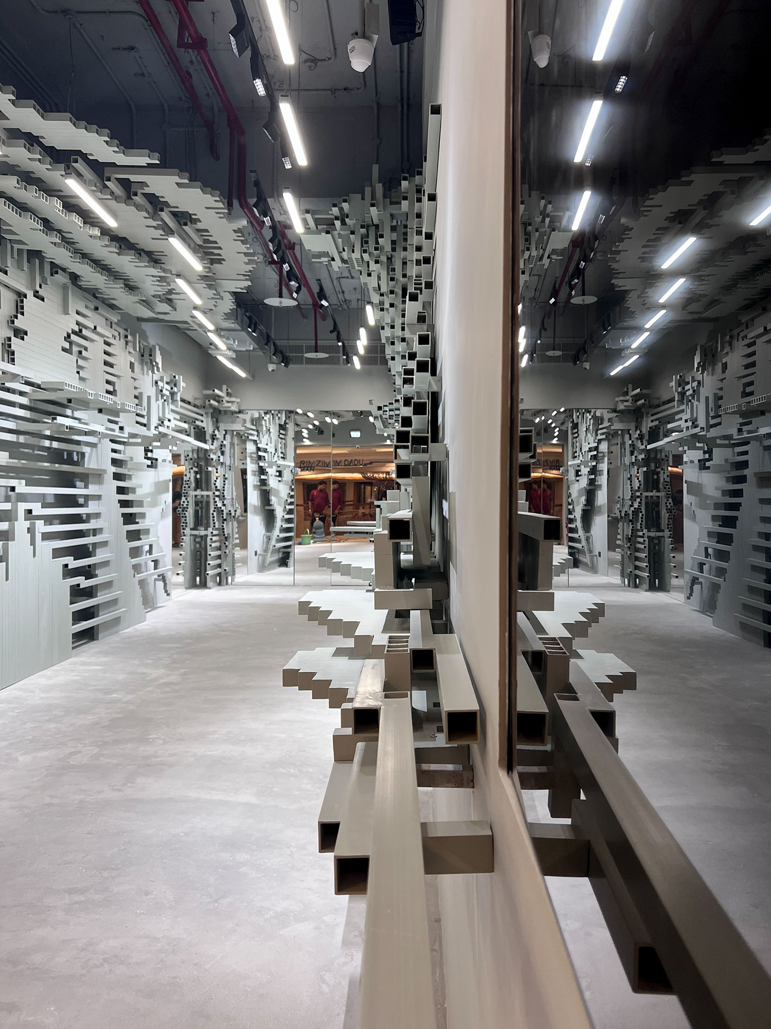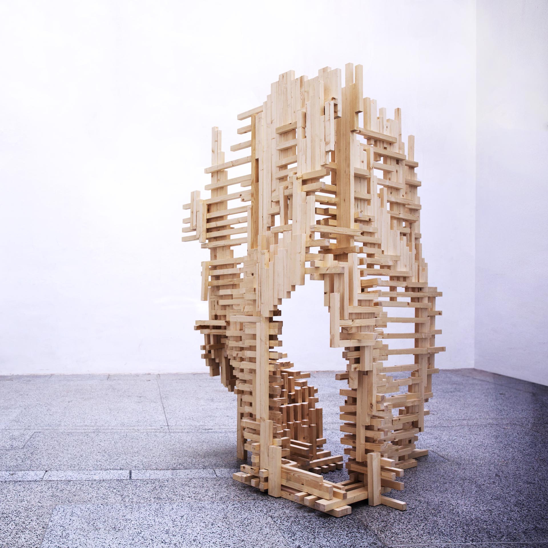 The positioning of the façade walls has been developed according to a custom written flow simulation. The algorithm describes a flow that is influenced and altered by a set of deflectors, which each act according to the magnitude of their attraction and the area of their influence.
