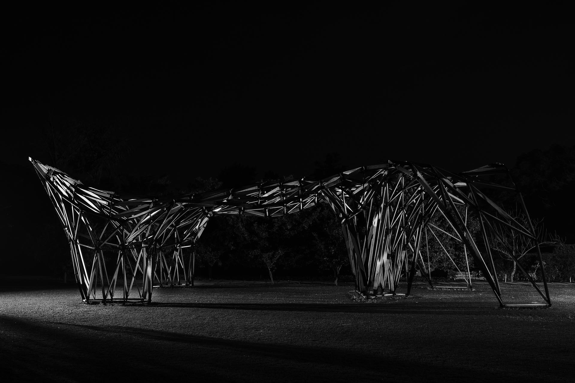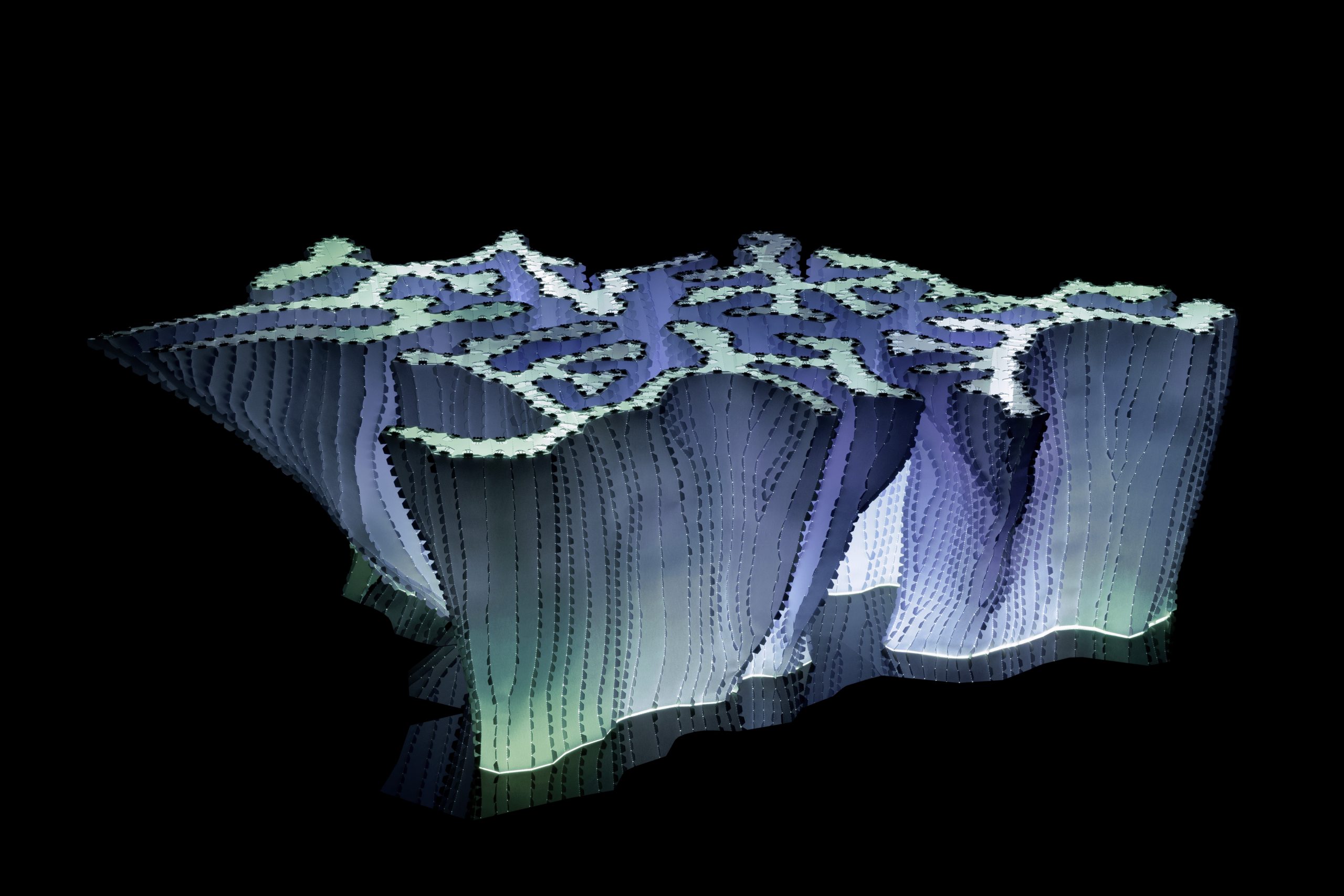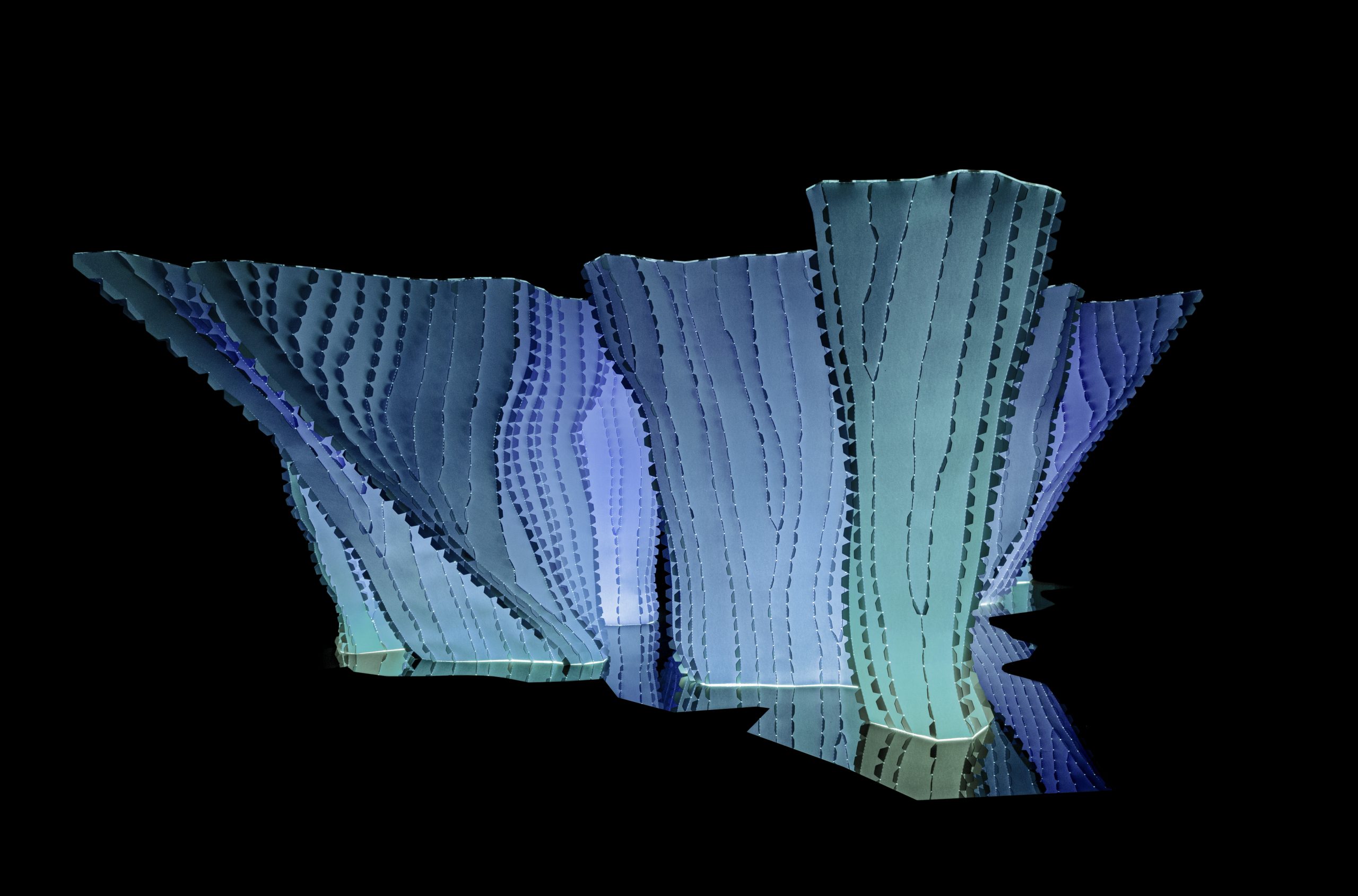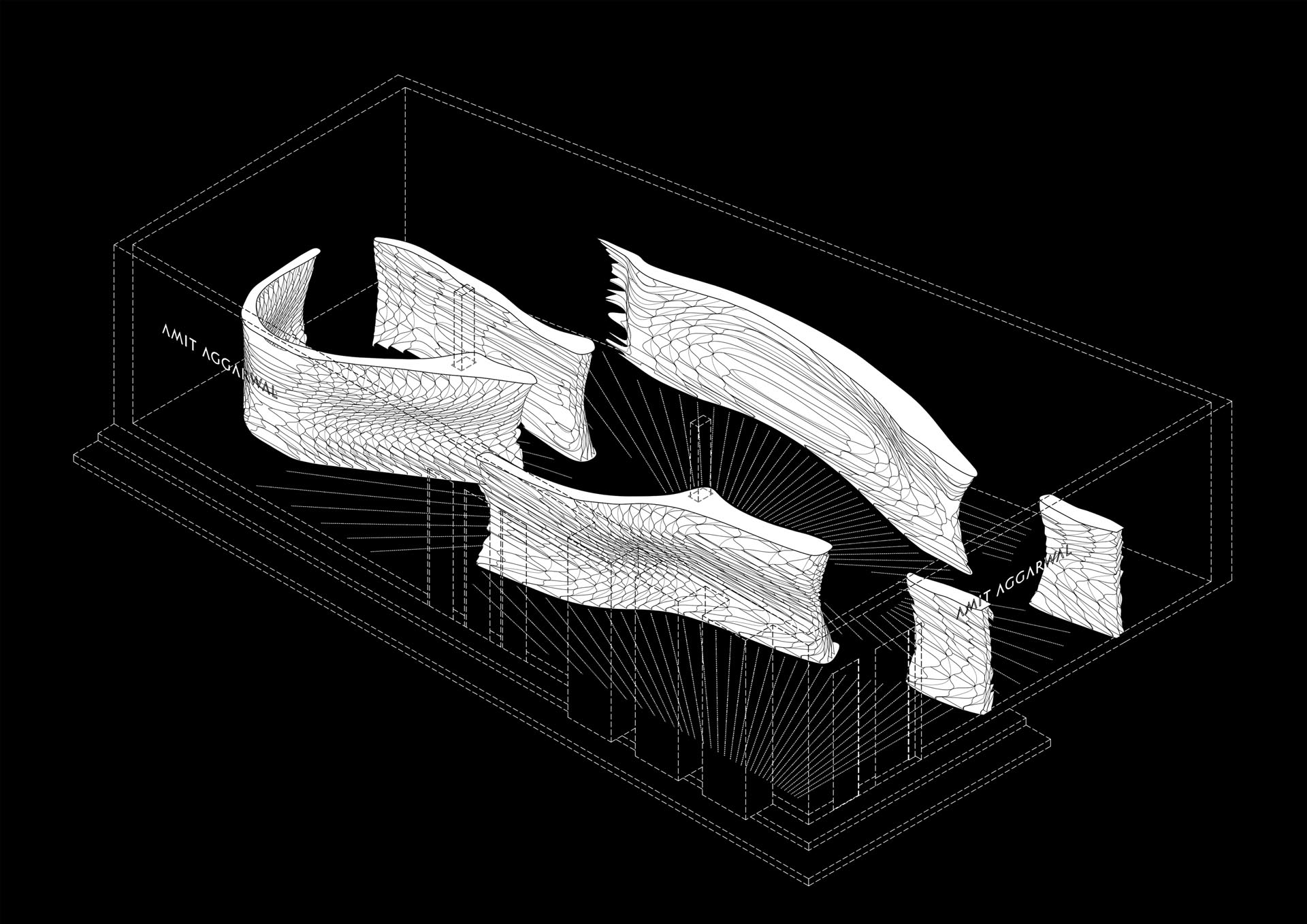 Busan Opera House becomes the physical manifestation of Klavierstück I, a frozen piece of music. The design for the opera house is based on a simple strip morphology instead of a twelve tone row, which creates the facade, structure and rhythm within itself, its repetition happening in space instead of time. Layers of the strips form the façade structure, and the shifting and alteration of these patterns results in the formation of complex architectural rhythms which are used to control the light, view and shading properties of the façade. The system has also been used for the design of our installation Anisotropia.