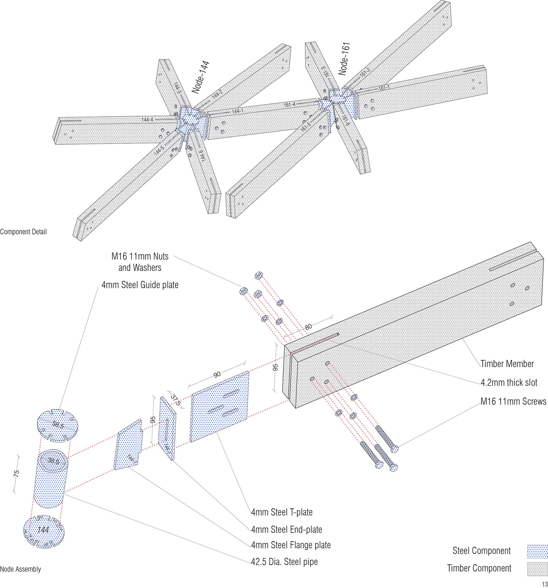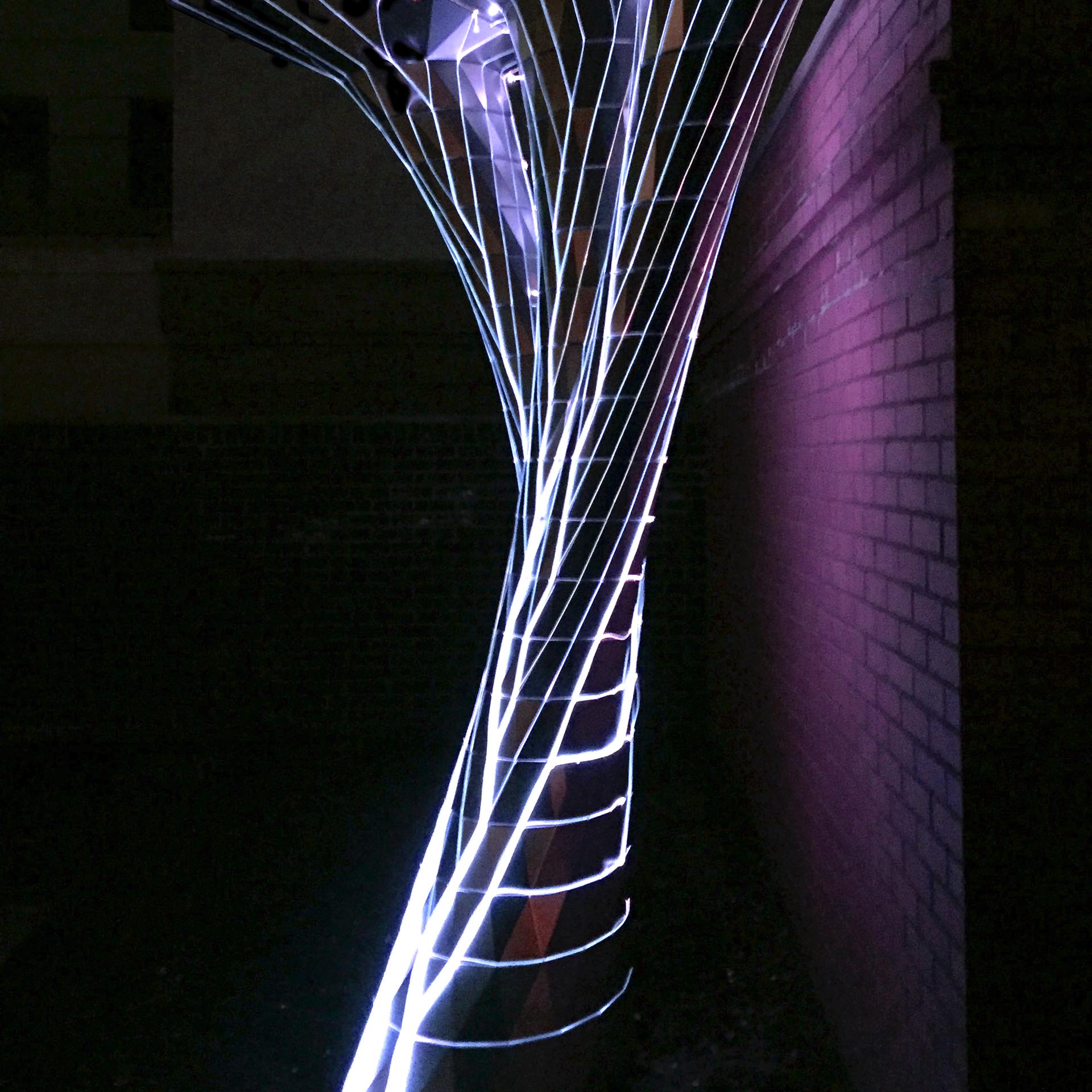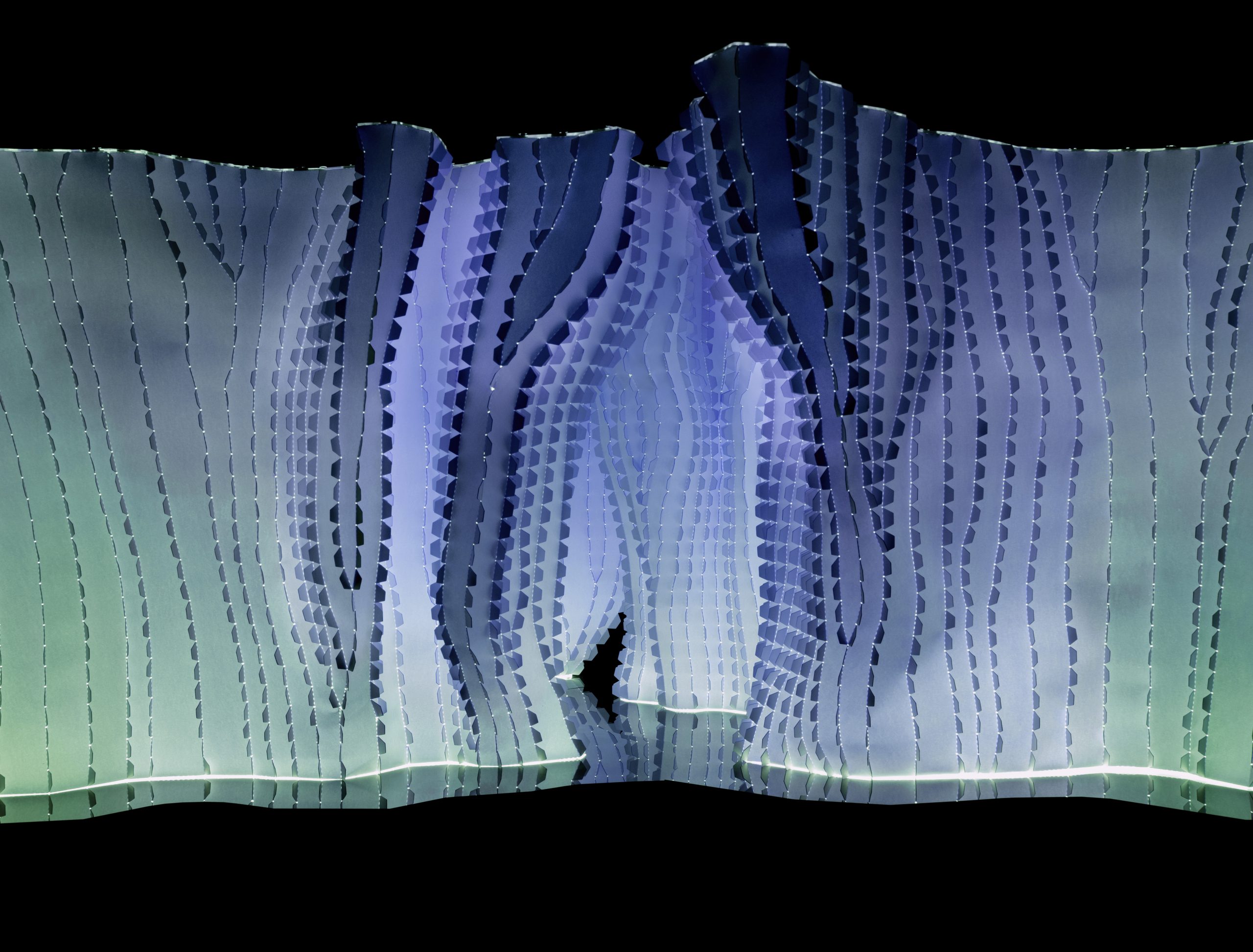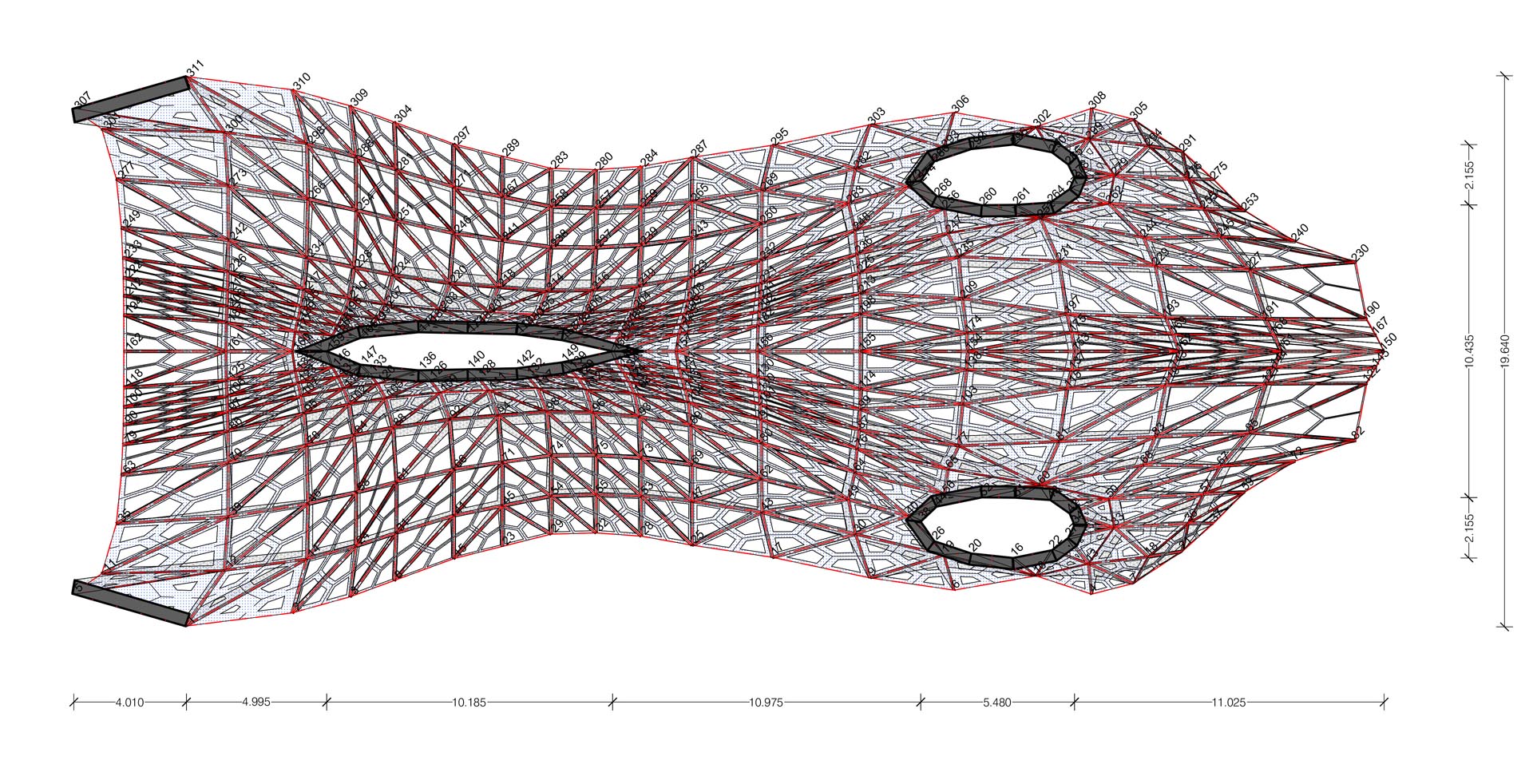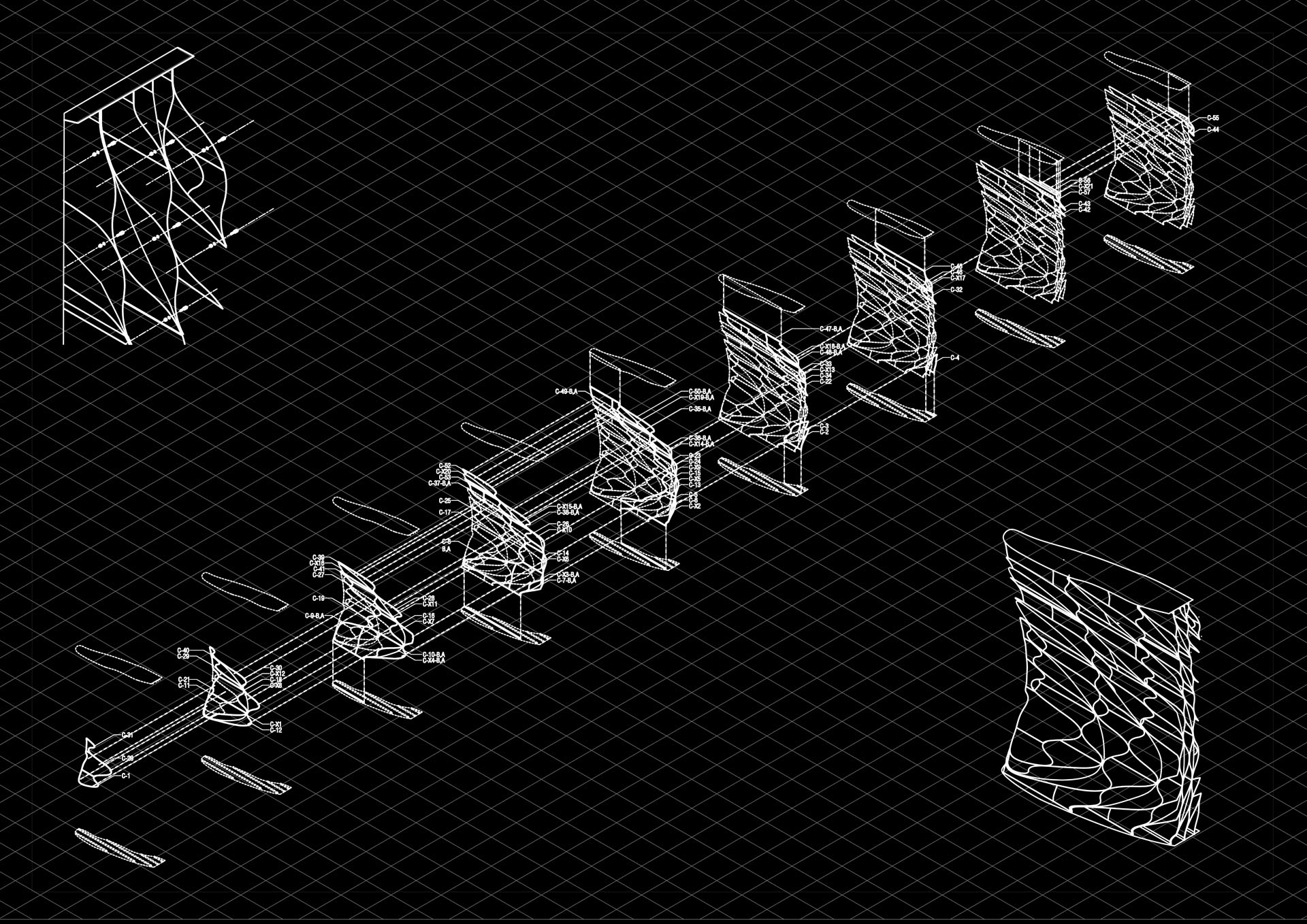 The proposed façade structure becomes the physical manifestation of Klavierstück I. Instead of on a twelve tone row, it is based on a strip morphology made from curved steel sections that creates the facade, structure and rhythm within itself. The repetition of the lamella happens in space, instead of the repetition in time of the twelve tone row. Parallel layers of the strips form the façade structure, and the alteration of its patterns results in architectural rhythms which are used to control the light, view and shading properties of the façade.