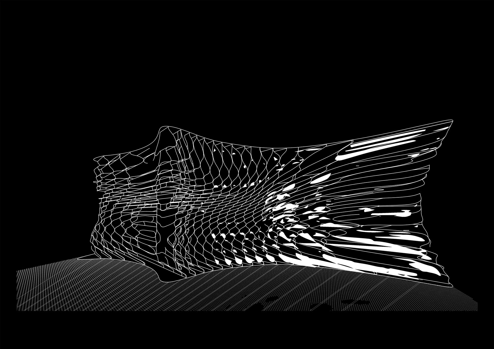 The distribution of the programmatic elements on the site is used as the deflector set that guides the flow of the rhythm lines which originate from the sea. On their way towards the city, the lines flow around the building elements such as the theatre and auditoriums, splitting up and being diverted by the deflectors.