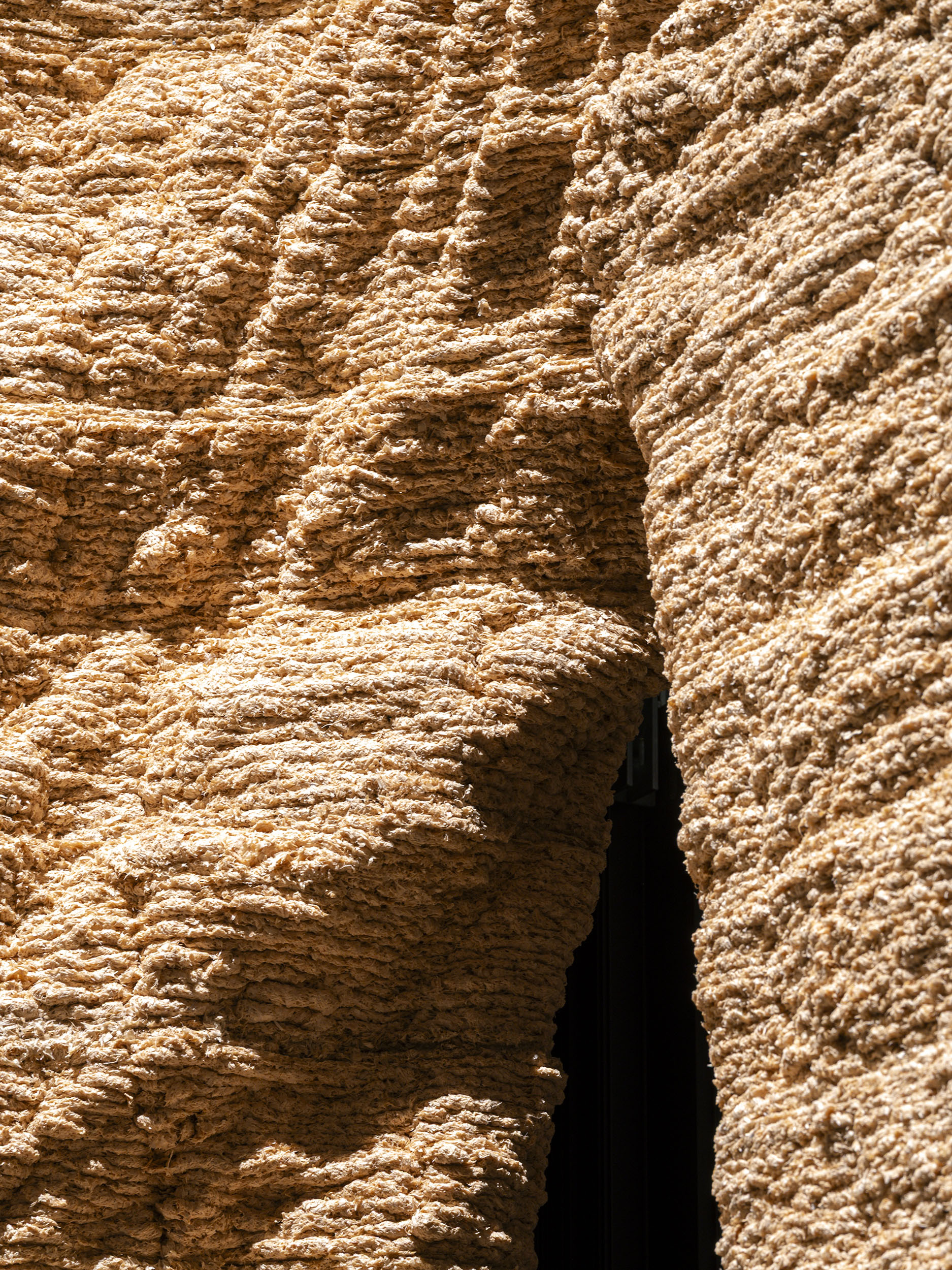 The façade structure is altered in the length of its repetition, but also the orientation and the depth of the extrusions are manipulated in order to control the view and light, depending on the programmatic requirements on the inside of the building.
